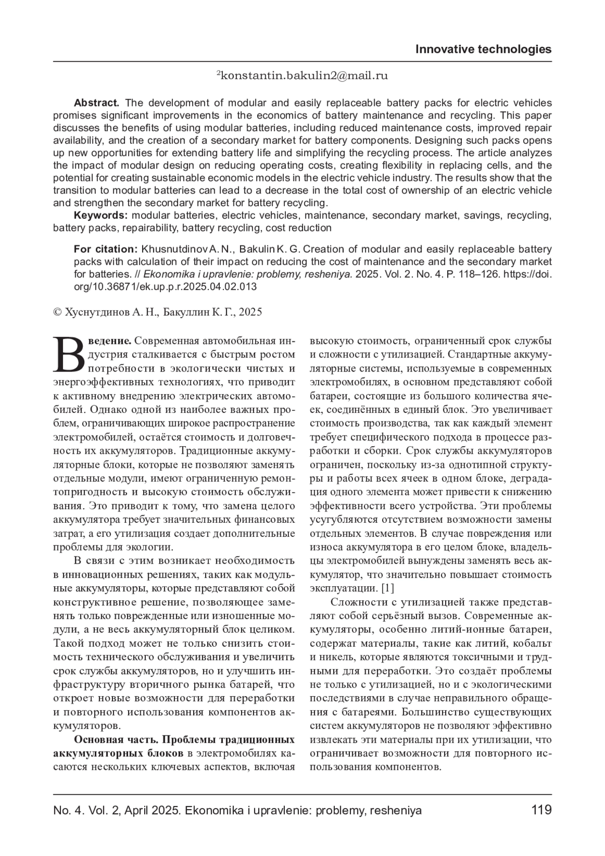 Разработка модульных и легко заменяемых аккумуляторных блоков для электромобилей обещает значительные улучшения в экономике технического обслуживания и переработки батарей. В данной статье рассматриваются преимущества использования модульных аккумуляторов, включая снижение затрат на обслуживание, улучшение доступности ремонта и создание вторичного рынка для компонентов аккумуляторов. Проектирование таких блоков открывает новые возможности для продления срока службы аккумуляторов и упрощения процесса их утилизации. Статья анализирует влияние модульной конструкции на снижение эксплуатационных расходов, создание гибкости в замене элементов и потенциал для создания устойчивых экономических моделей в индустрии электромобилей. Результаты показывают, что переход на модульные аккумуляторы может привести к снижению общей стоимости владения электромобилем и усилению вторичного рынка переработки батарей.