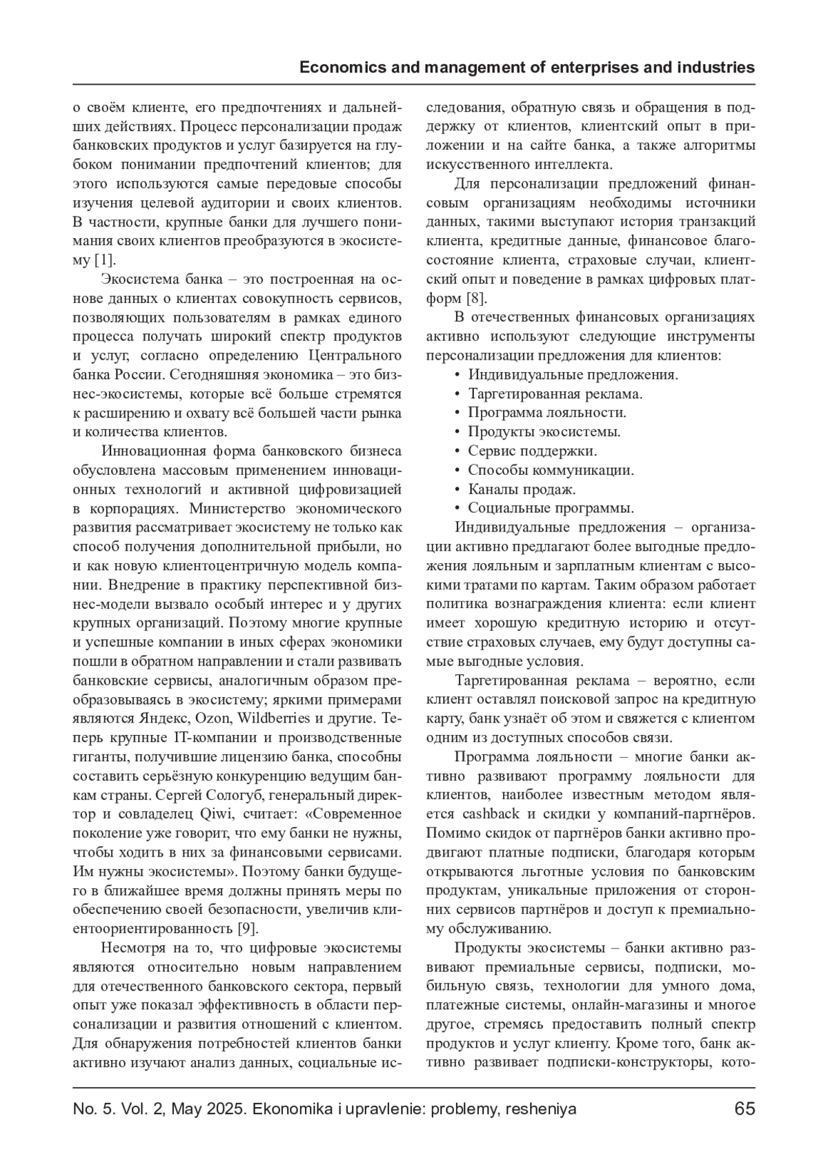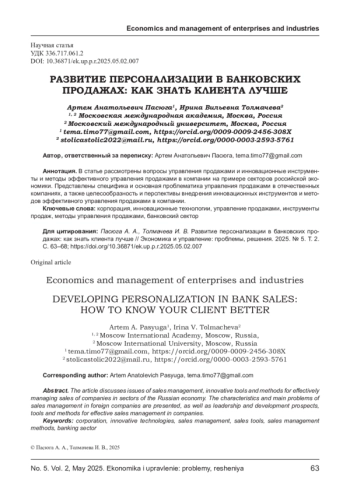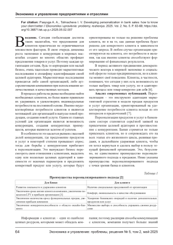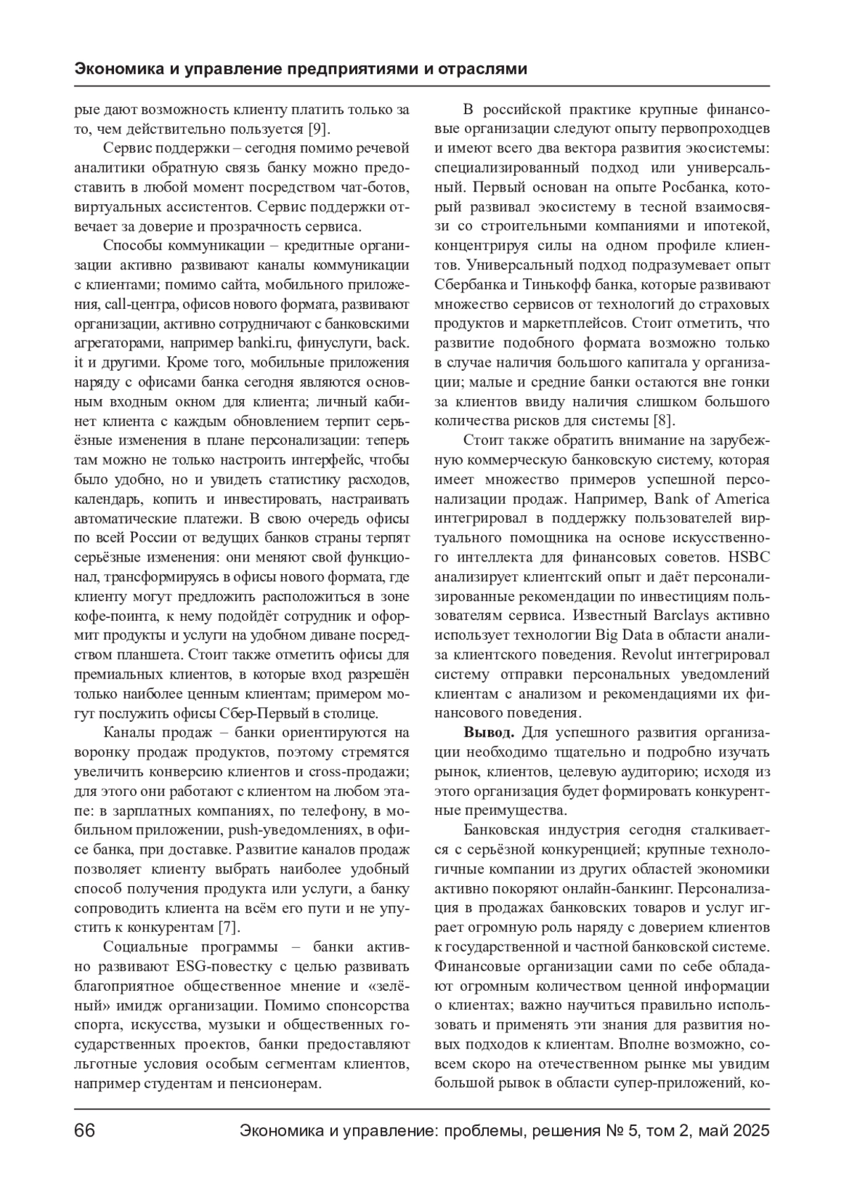 ПАСЮГА А. А., ТОЛМАЧЕВА И. В. РАЗВИТИЕ ПЕРСОНАЛИЗАЦИИ В БАНКОВСКИХ ПРОДАЖАХ: КАК ЗНАТЬ КЛИЕНТА ЛУЧШЕ // ЭКОНОМИКА И УПРАВЛЕНИЕ: ПРОБЛЕМЫ, РЕШЕНИЯ. 2025. ТОМ 2 № 5