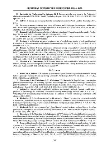 1. Батлук Ю. В., Пойлова Я. П. Суицидальные тенденции у людей с татуировкой // Вестник СПбГУ. Серия 16: Психология. Педагогика. 2020. Т. 10. № 3. С. 338-352. DOI: 10.21638/spbu16.2020.309 EDN: TVFJNX