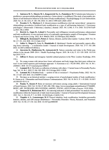 9. Смирнова М. В., Марьин М. И., Касперович Ю. Г., Пастухова М. В. Исследование личностных предикторов самоповреждающего поведения в форме телесных модификаций // Психопедагогика в правоохранительных органах. 2020. Т. 25. № 2 (81). С. 188-196. DOI: 10.24411/1999-6241-2020-12010 EDN: GAFZAN