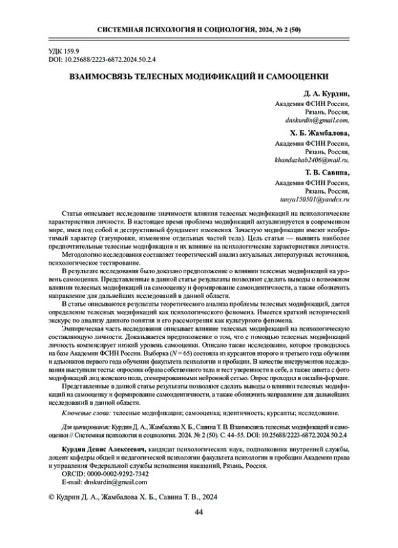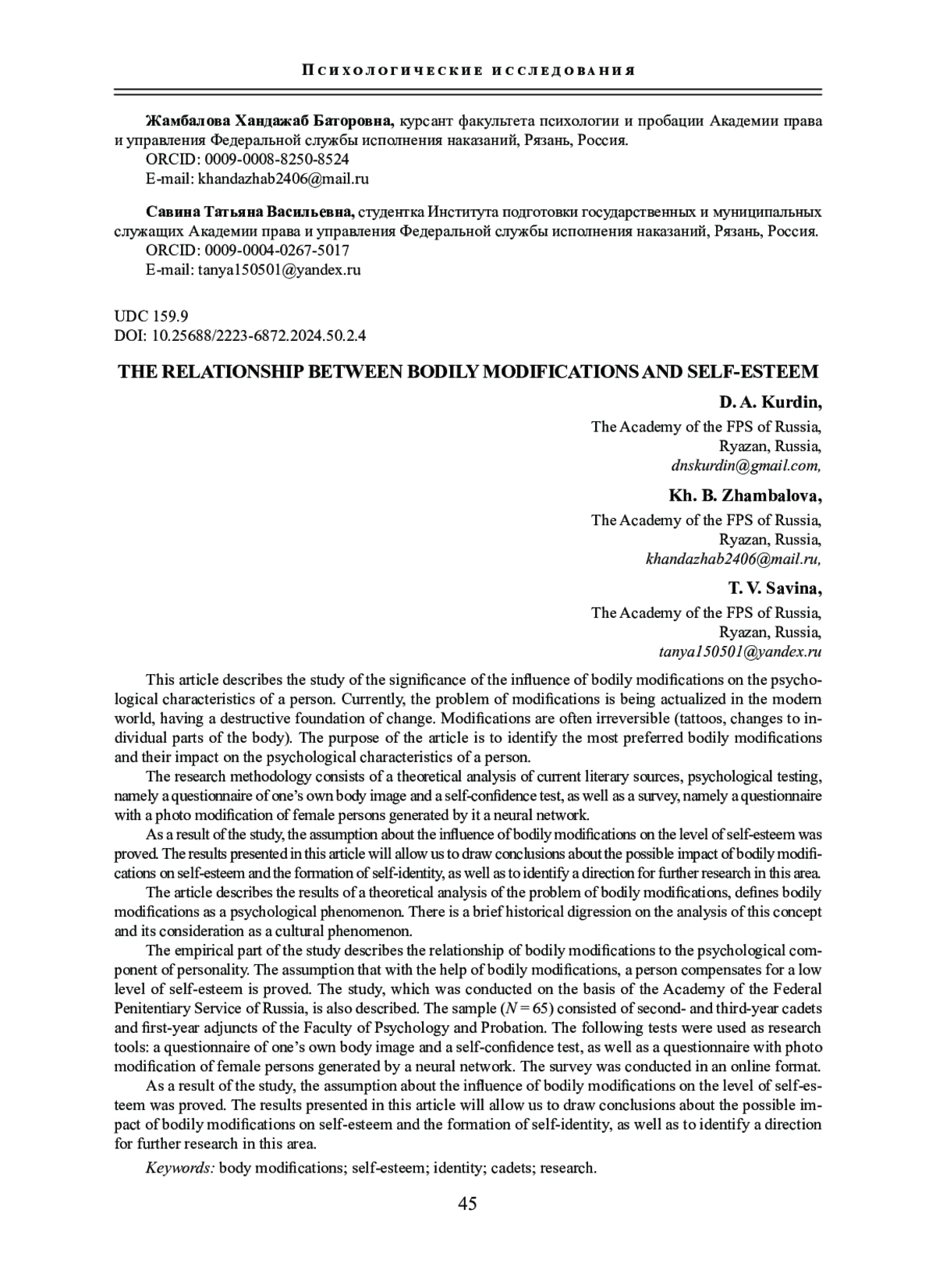 Эмпирическая часть исследования описывает влияние телесных модификаций на психологическую составляющую личности. Доказывается предположение о том, что с помощью телесных модификаций личность компенсирует низкий уровень самооценки. Описано также исследование, которое проводилось на базе Академии ФСИН России. Выборка ( N = 65) состояла из курсантов второго и третьего года обучения и адъюнктов первого года обучения факультета психологии и пробации. В качестве инструментов исследования выступили тесты: опросник образа собственного тела и тест уверенности в себе, а также анкета с фото модификаций лиц женского пола, сгенерированными нейронной сетью. Опрос проходил в онлайн-формате.