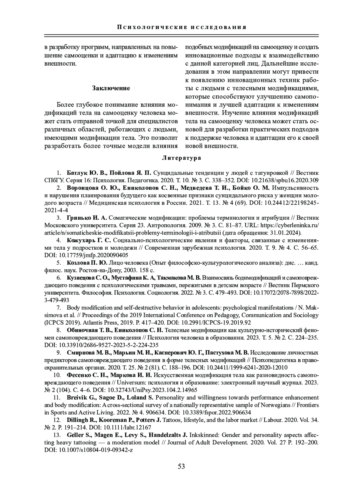 19. Deviance as an historical artefact: a scoping review of psychological studies of body modification / R. Owens et al. // Humanities and Social Sciences Communications. 2023. Vol. 10. № 33. P. 1-10. 10.1057/ s41599-023-01511-6. DOI: 10.1057/s41599-023-01511-6 EDN: XZHBMS