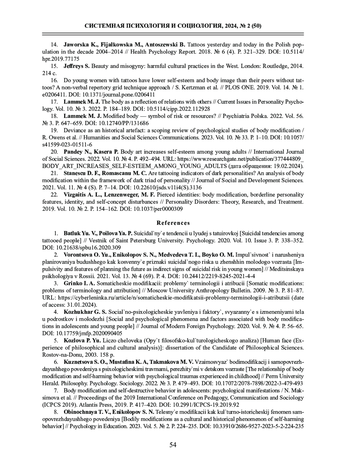 13. Geller S., Magen E., Levy S., Handelzalts J. Inkskinned: Gender and personality aspects affecting heavy tattooing - a moderation model // Journal of Adult Development. 2020. Vol. 27 P. 192-200. DOI: 10.1007/s10804-019-09342-z EDN: XKYFYW