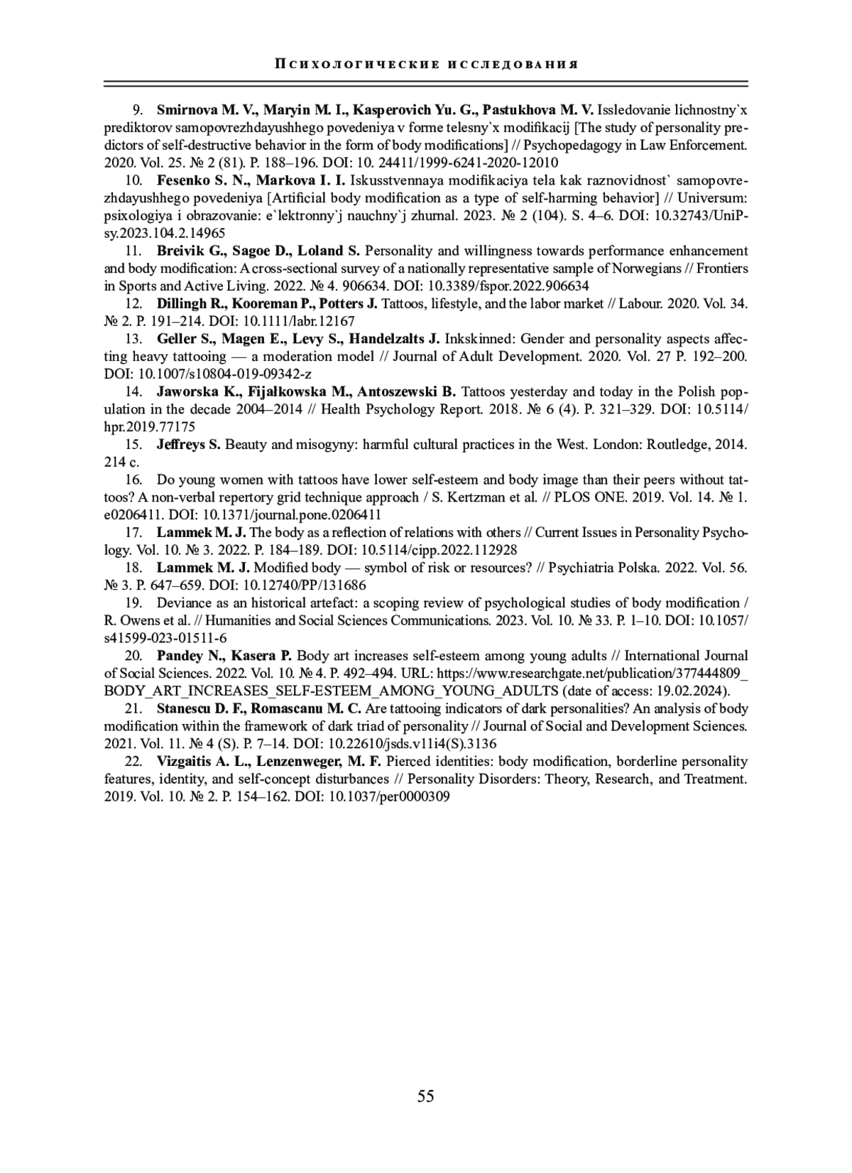 21. Stanescu D. F., Romascanu M. C. Are tattooing indicators of dark personalities? An analysis of body modification within the framework of dark triad of personality // Journal of Social and Development Sciences. 2021. Vol. 11. № 4 (S). P. 7-14. DOI: 10.22610/jsds.v11i4(S).3136 EDN: WNSQMU