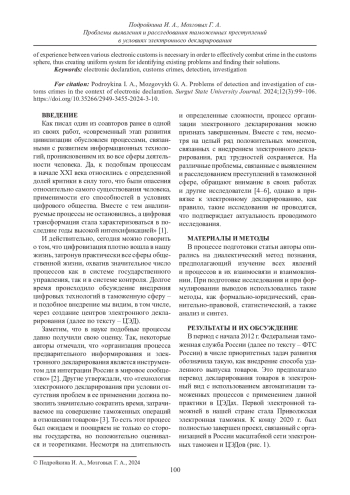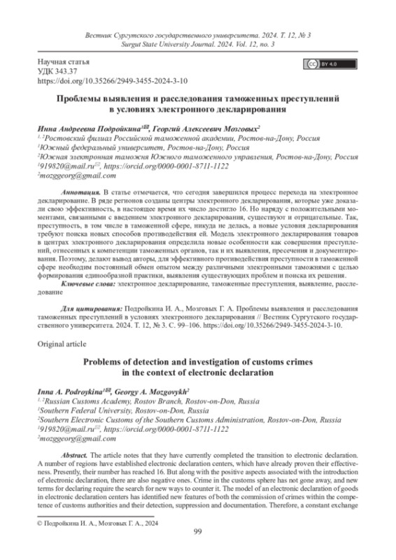 В статье отмечается, что сегодня завершился процесс перехода на электронное декларирование. В ряде регионов созданы центры электронного декларирования, которые уже доказали свою эффективность, в настоящее время их число достигло 16. Но наряду с положительными моментами, связанными с введением электронного декларирования, существуют и отрицательные. Так, преступность, в том числе в таможенной сфере, никуда не делась, а новые условия декларирования требуют поиска новых способов противодействия ей. Модель электронного декларирования товаров в центрах электронного декларирования определила новые особенности как совершения преступлений, отнесенных к компетенции таможенных органов, так и их выявления, пресечения и документирования. Поэтому, делают вывод авторы, для эффективного противодействия преступности в таможенной сфере необходим постоянный обмен опытом между различными электронными таможнями с целью формирования единообразной практики, выявления существующих проблем и поиска их решения.