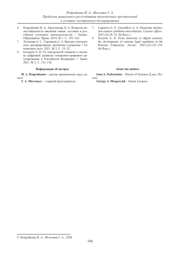 8. Козырин А. Н. От электронной таможни к таможне цифровой: развитие таможенно-правового регулирования в Российской Федерации // Закон. 2021. № 2. С. 118-130.