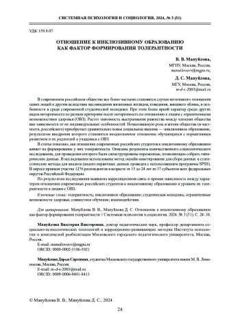 7. Мануйлова В. В. Готовность административно-управленческих и педагогических команд профессиональных образовательных организаций к реализации инклюзивных процессов // Коррекционная педагогика: теория и практика. 2023. № 3 (97). С. 23-27. https://www. DOI: 10.52252/26867222_2023_3_23 EDN: DAVMOI