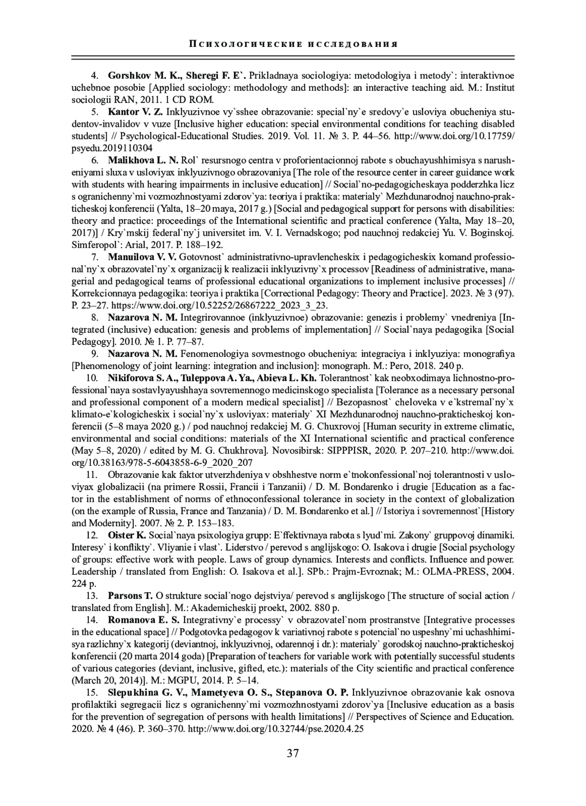 5. Кантор В. З. Инклюзивное высшее образование: специальные средовые условия обучения студентов-инвалидов в вузе // Психолого-педагогические исследования. 2019. Т. 11. № 3. С. 44-56. http://www. DOI: 10.17759/psyedu.2019110304 EDN: SIISQA