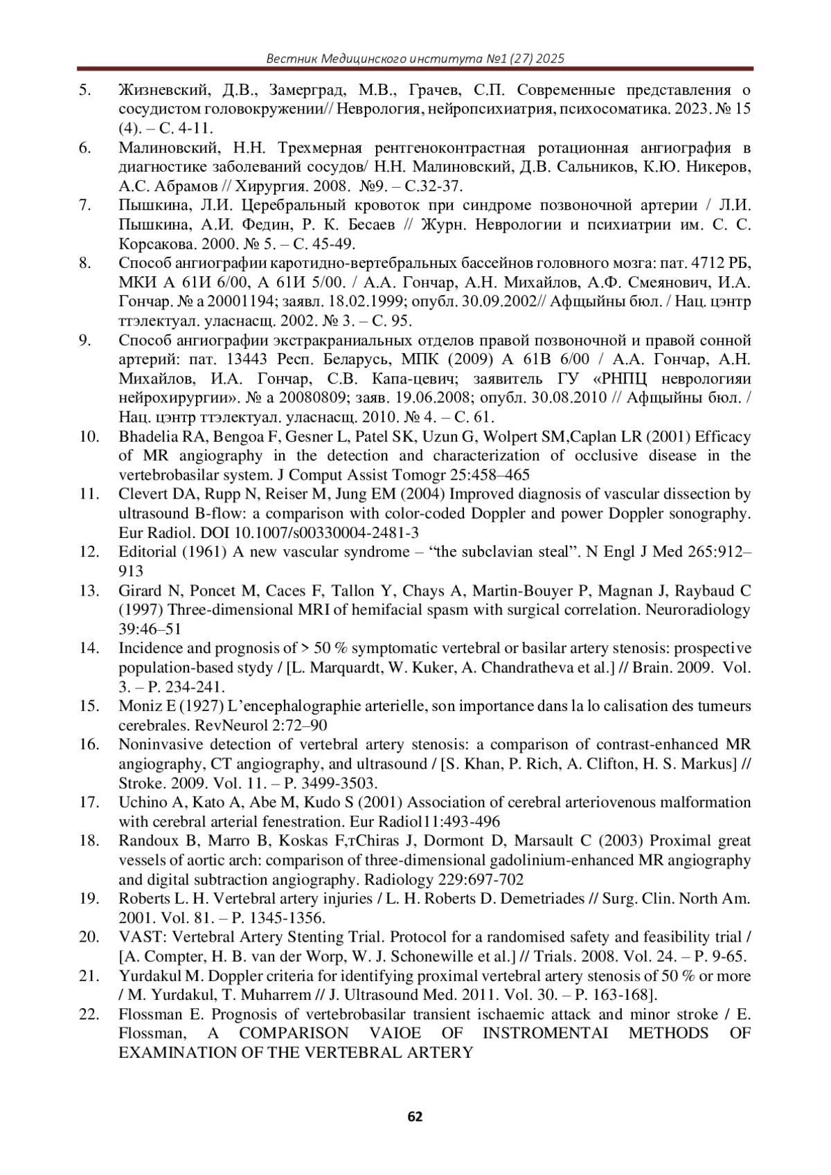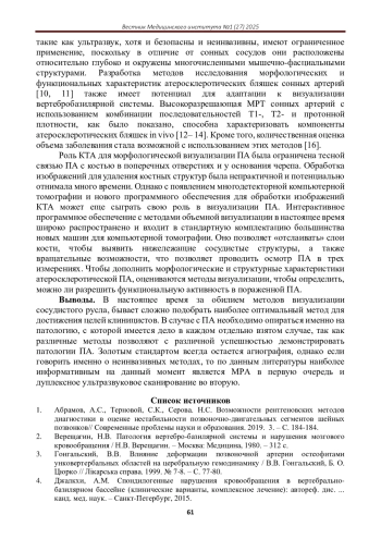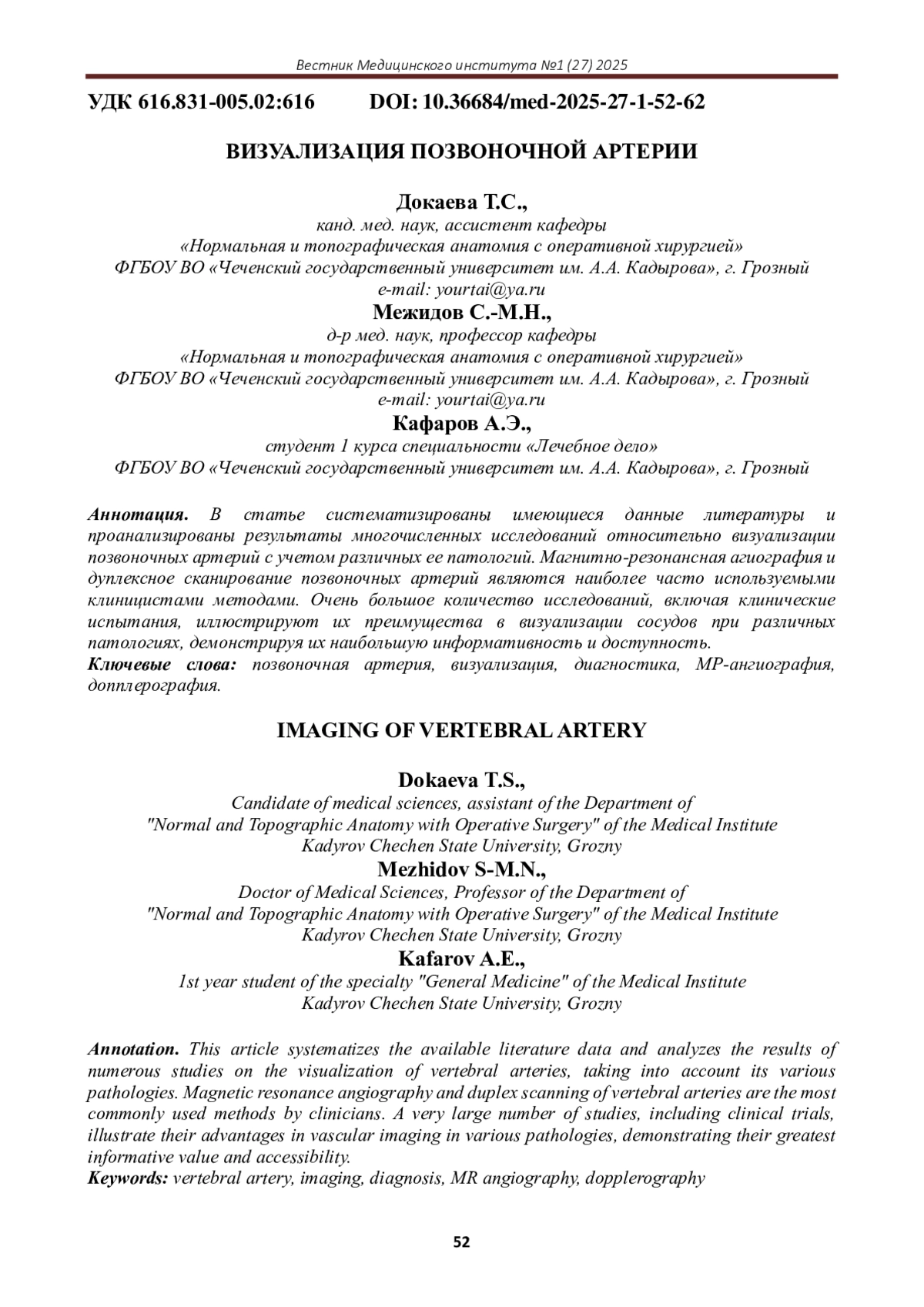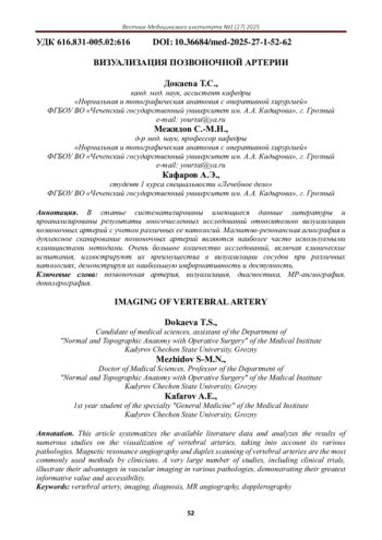 ДОКАЕВА Т.С., МЕЖИДОВ С.-М.Н., КАФАРОВ А.Э. ВИЗУАЛИЗАЦИЯ ПОЗВОНОЧНОЙ АРТЕРИИ // ВЕСТНИК МЕДИЦИНСКОГО ИНСТИТУТА. 2025. № 1 (27)