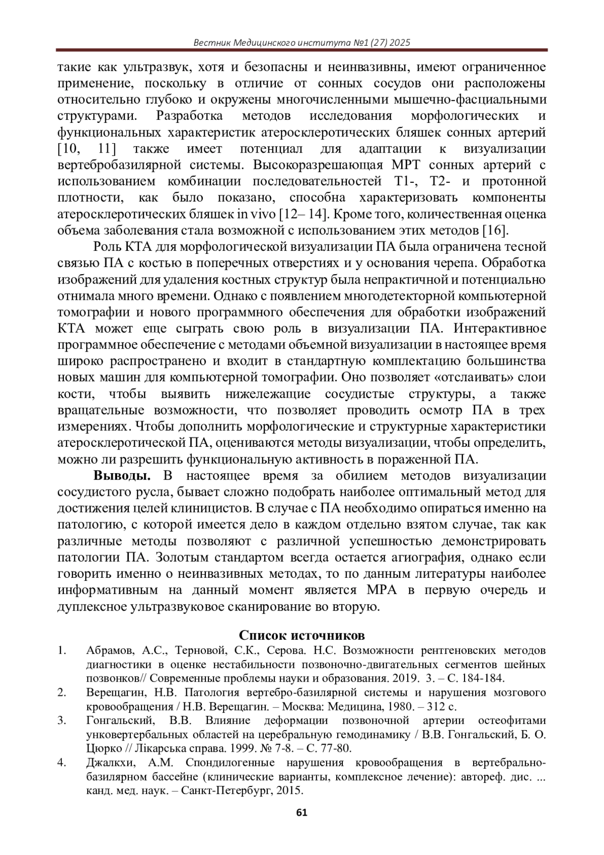 Ключевые фразы: позвоночная артерия, визуализация, диагностика, мр-ангиография, допплерография