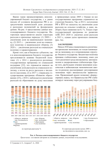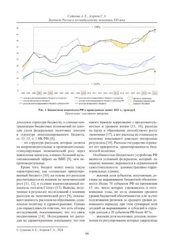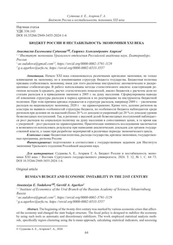 Начало XXI века ознаменовалось различными кризисами экономики, не только влияющими на экономику, но и изменяющими структуру бюджета государства. Бюджетная политика призвана стабилизовать экономику, имея для этого различные инструменты: автоматические и дискреционные стабилизаторы. В работе использованы методы статистического анализа: кластеризация регионов методом k-среднего, расчет статистических показателей, анализ бюджетов с расчетом доли по статьям расходов и в приведенном значении к 2005 г. на душу населения. Сформулированы выводы об изменении структуры расходов в период кризисов и их реагирование на инструменты бюджетной политики. При этом причина кризиса отражается в структуре расходов, например 2009 г. – увеличение расходов на национальную экономику, 2020 г. – на здравоохранение. Кроме того, деление регионов на кластеры не выявило особенностей структуры бюджета, но особенности бюджета наблюдаются среди регионов при делении их на высокий (более 20 % от доходов) и умеренный (до 20 % от доходов) уровни безвозмездных поступлений. Так, в регионах с высокой долей безвозмездных поступлений наблюдается рост расходов на социальную политику на душу населения в сопоставимых ценах, в то время как с умеренной – рост расходов на здравоохранение. Практическая значимость исследования заключается в возможности использовать результаты при написании аналитических докладов для органов государственной власти, а также при разработке мероприятий в различные периоды экономического цикла.Начало XXI века ознаменовалось различными кризисами экономики, не только влияющими на экономику, но и изменяющими структуру бюджета государства. Бюджетная политика призвана стабилизовать экономику, имея для этого различные инструменты: автоматические и дискреционные стабилизаторы. В работе использованы методы статистического анализа: кластеризация регионов методом k-среднего, расчет статистических показателей, анализ бюджетов с расчетом доли по статьям расходов и в приведенном значении к 2005 г. на душу населения. Сформулированы выводы об изменении структуры расходов в период кризисов и их реагирование на инструменты бюджетной политики. При этом причина кризиса отражается в структуре расходов, например 2009 г. – увеличение расходов на национальную экономику, 2020 г. – на здравоохранение. Кроме того, деление регионов на кластеры не выявило особенностей структуры бюджета, но особенности бюджета наблюдаются среди регионов при делении их на высокий (более 20 % от доходов) и умеренный (до 20 % от доходов) уровни безвозмездных поступлений. Так, в регионах с высокой долей безвозмездных поступлений наблюдается рост расходов на социальную политику на душу населения в сопоставимых ценах, в то время как с умеренной – рост расходов на здравоохранение. Практическая значимость исследования заключается в возможности использовать результаты при написании аналитических докладов для органов государственной власти, а также при разработке мероприятий в различные периоды экономического цикла.