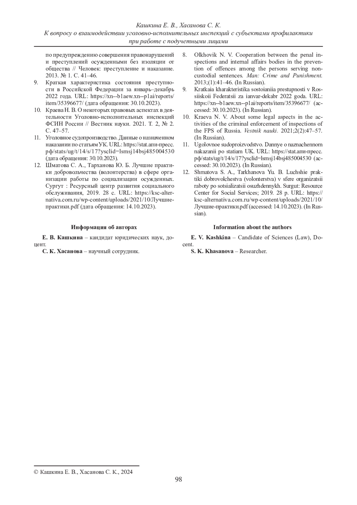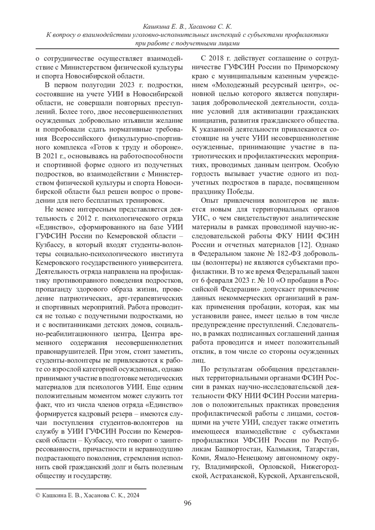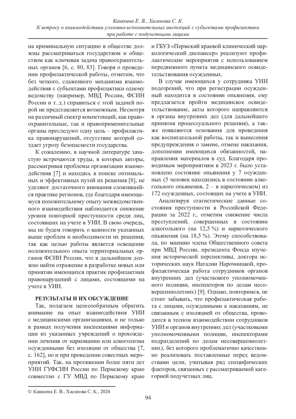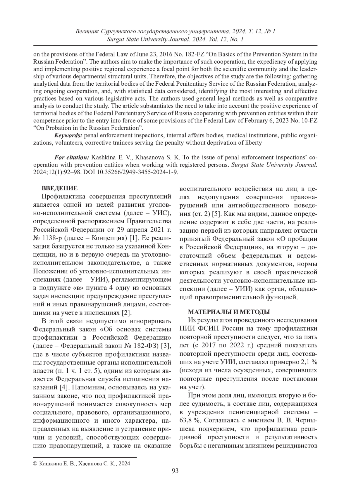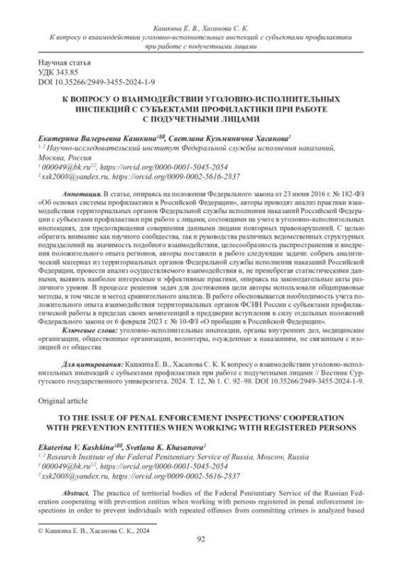 КАШКИНА Е. В., ХАСАНОВА С. К. К ВОПРОСУ О ВЗАИМОДЕЙСТВИИ УГОЛОВНО-ИСПОЛНИТЕЛЬНЫХ ИНСПЕКЦИЙ С СУБЪЕКТАМИ ПРОФИЛАКТИКИ ПРИ РАБОТЕ С ПОДУЧЕТНЫМИ ЛИЦАМИ // ВЕСТНИК СУРГУТСКОГО ГОСУДАРСТВЕННОГО УНИВЕРСИТЕТА. 2024. ТОМ 12, № 1