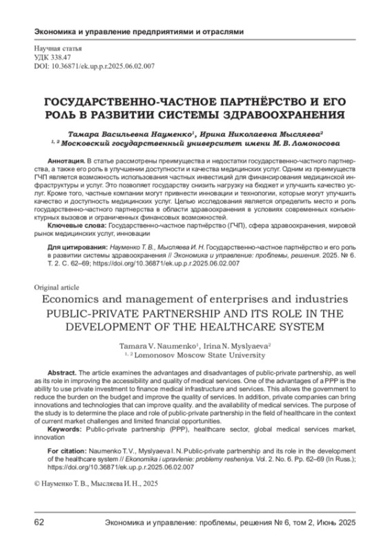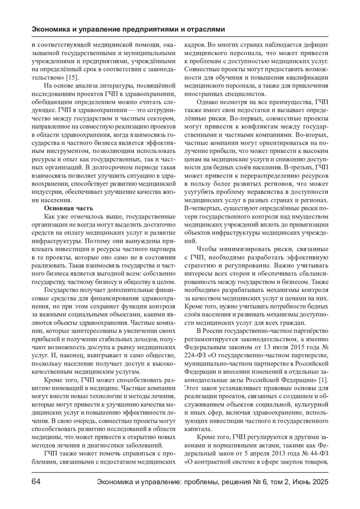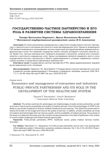 В статье рассмотрены преимущества и недостатки государственно - частного партнерства, а также его роль в улучшении доступности и качества медицинских услуг. Одним из преимуществ ГЧП является возможность использования частных инвестиций для финансирования медицинской инфраструктуры и услуг. Это позволяет государству снизить нагрузку на бюджет и улучшить качество услуг. Кроме того, частные компании могут привнести инновации и технологии, которые могут улучшить качество и доступность медицинских услуг.