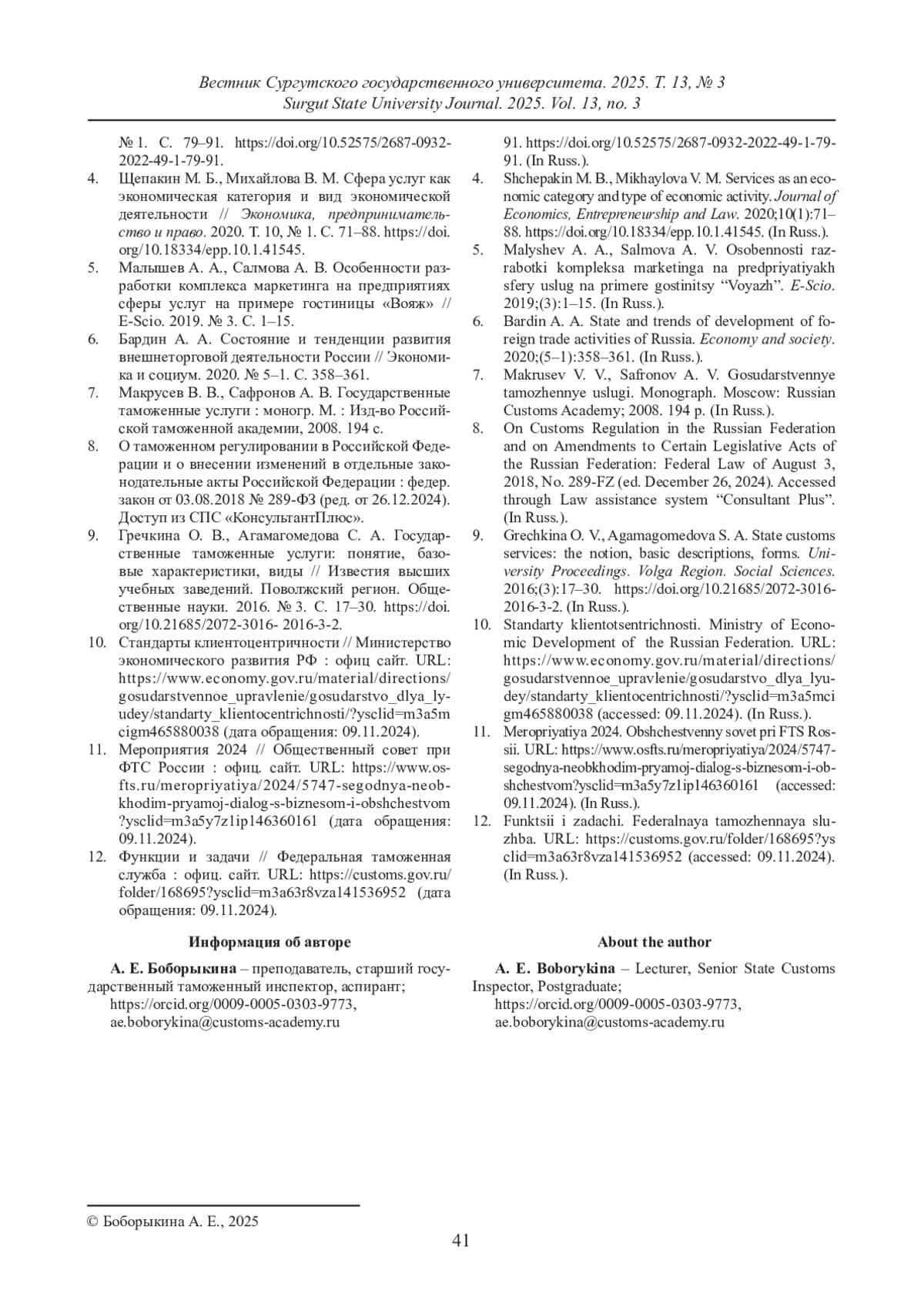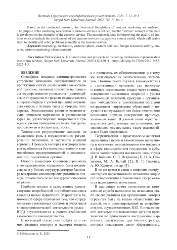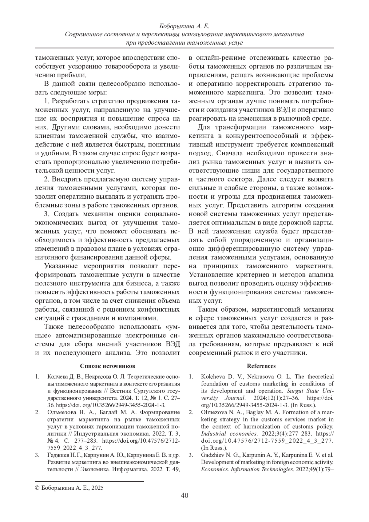 1. Колчева Д. В., Некрасова О. Л. Теоретические основы таможенного маркетинга в контексте его развития и функционирования // Вестник Сургутского государственного университета. 2024. Т. 12, № 1. С. 27-36. https://doi. org/10.35266/2949-3455-2024-1-3.
