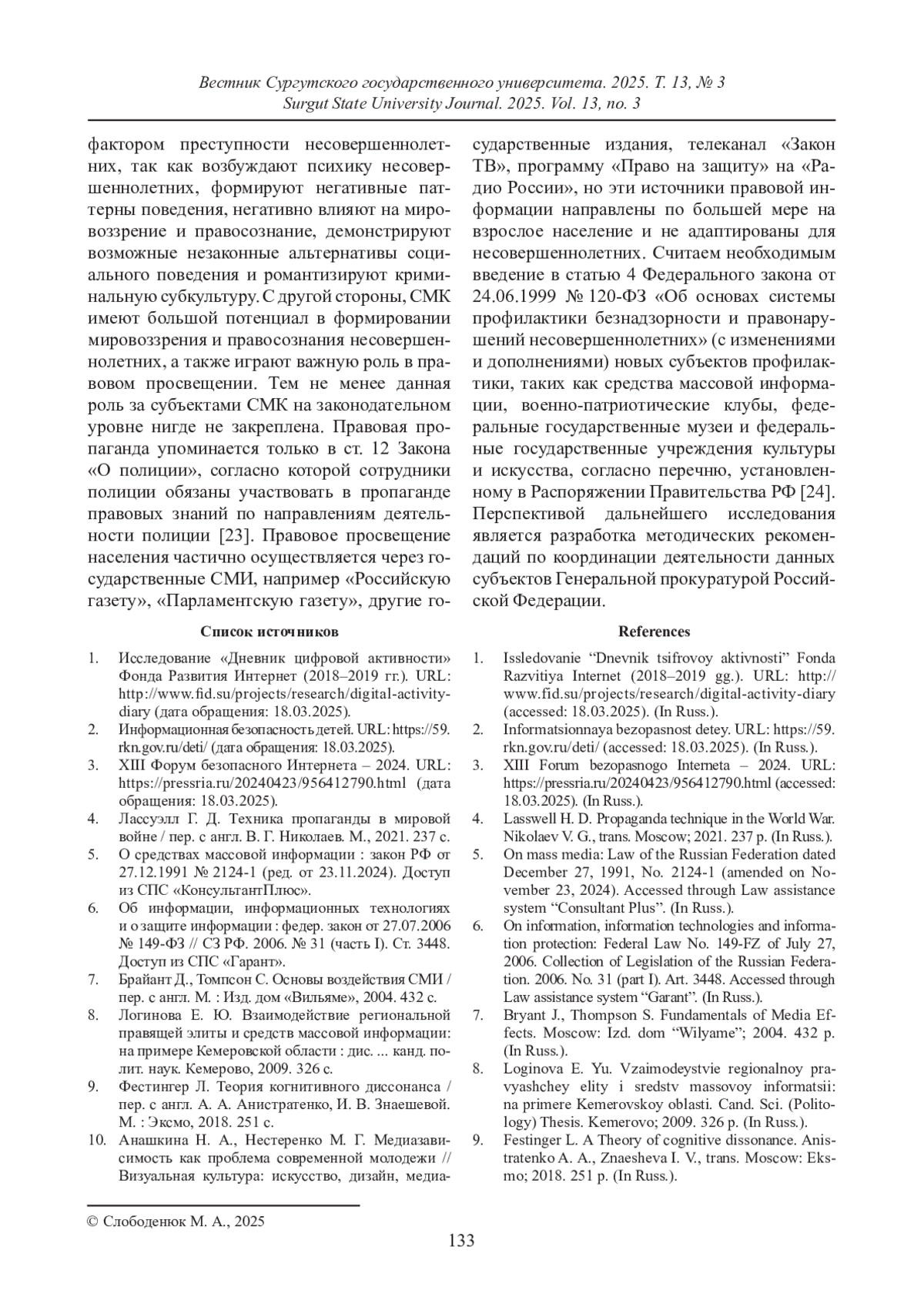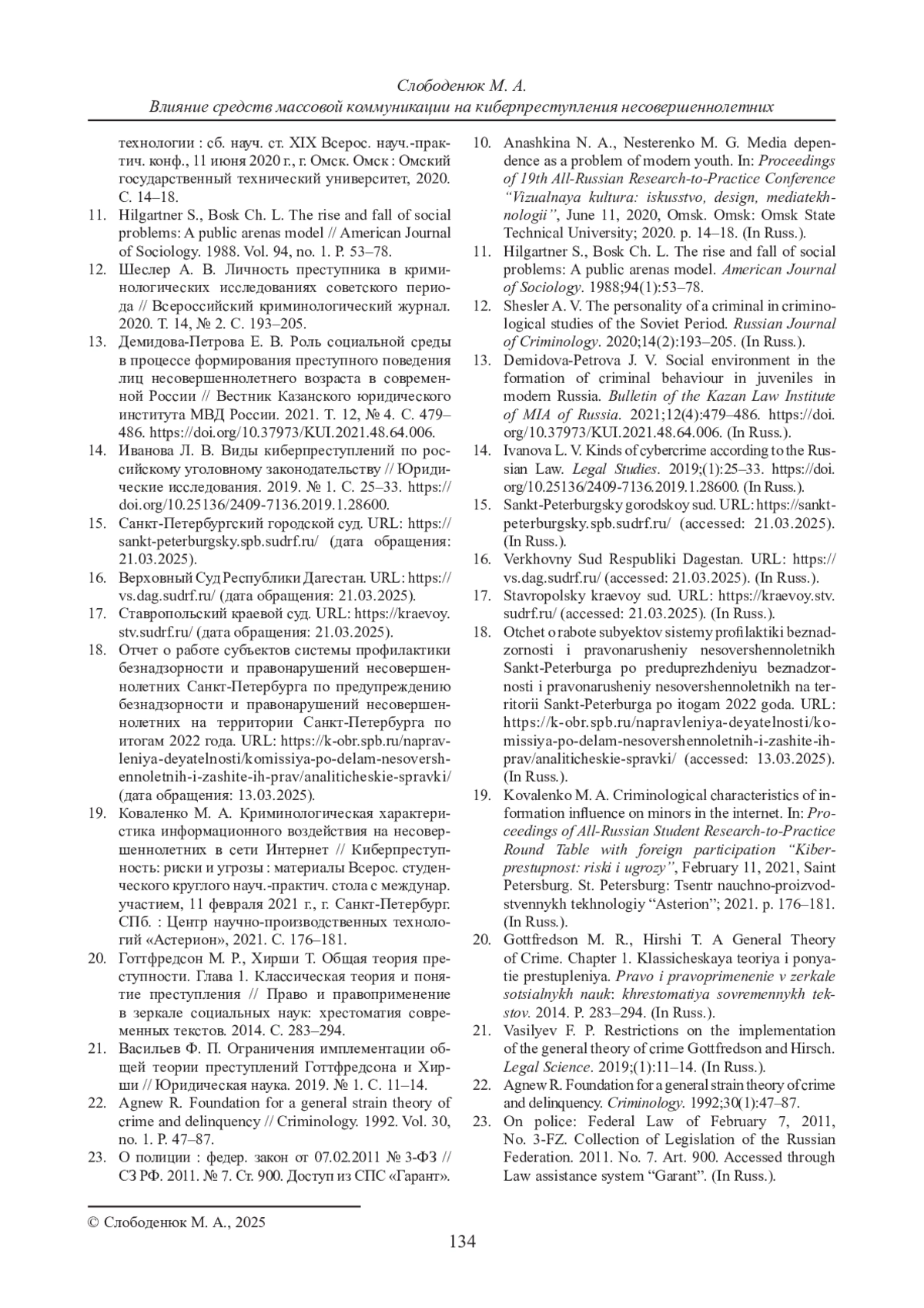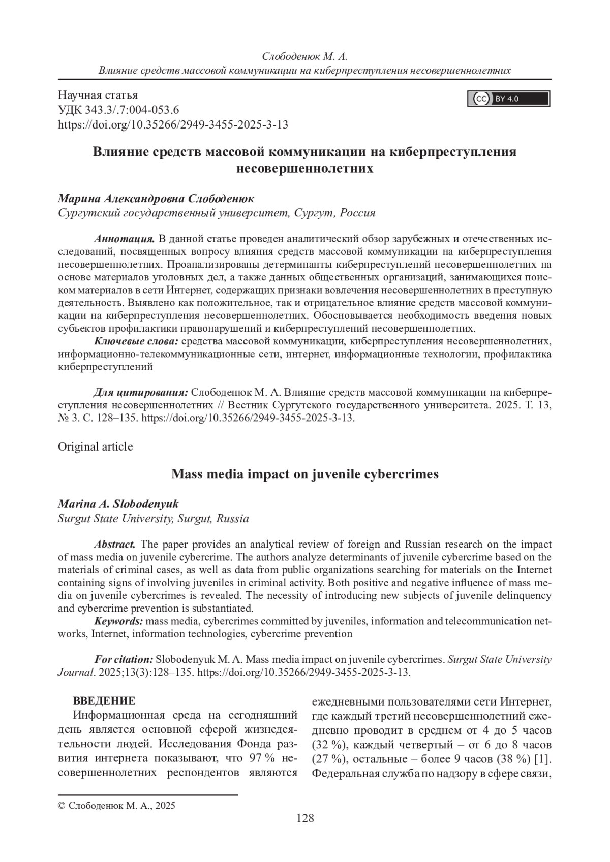 СЛОБОДЕНЮК М. А. ВЛИЯНИЕ СРЕДСТВ МАССОВОЙ КОММУНИКАЦИИ НА КИБЕРПРЕСТУПЛЕНИЯ НЕСОВЕРШЕННОЛЕТНИХ // ВЕСТНИК СУРГУТСКОГО ГОСУДАРСТВЕННОГО УНИВЕРСИТЕТА. 2025. ТОМ 13, № 1