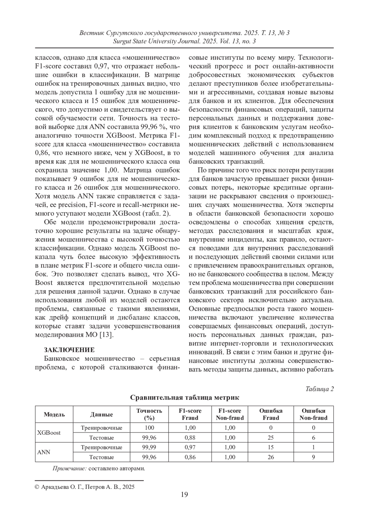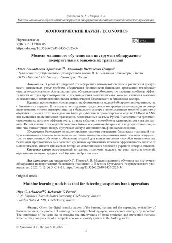 В условиях цифровой трансформации банковской системы и расширения доступности финансовых услуг проблема обеспечения безопасности банковских транзакций приобретает стратегическое значение. Актуальность темы обусловлена необходимостью изучения проблемы эффективности методов прогнозирования и предотвращения мошенничества, которые являются важными составляющими комплексной системы экономической безопасности в банковском секторе. В данном исследовании сделан акцент на формировании моделей обнаружения мошенничества с банковскими картами. В результате исследования предложены конкретные рекомендации по совершенствованию систем антифрод-защиты в банковском секторе с использованием моделей машинного обучения. В рамках этого исследования были разработаны и протестированы модели XGBoost и ANN для выявления мошеннических транзакций, реализованные на языке Python. Эксперименты продемонстрировали их высокую эффективность, а также гибкость и способность адаптироваться к новым данным. Использование этих моделей позволяет банкам оперативно обнаруживать подозрительные операции, что снижает риски потерь и улучшает общую защищенность финансовой системы. Обеспечение безопасного функционирования системы совершения банковских транзакций требует комплексного подхода, включающего не только внедрение современных аналитических инструментов, но и постоянное обучение и обновление моделей для выявления новых способов мошенничества. Реализация предложенных мер позволит кредитным организациям повысить эффективность защиты от мошенничества, снизить финансовые потери от мошеннических действий и укрепить доверие клиентов.