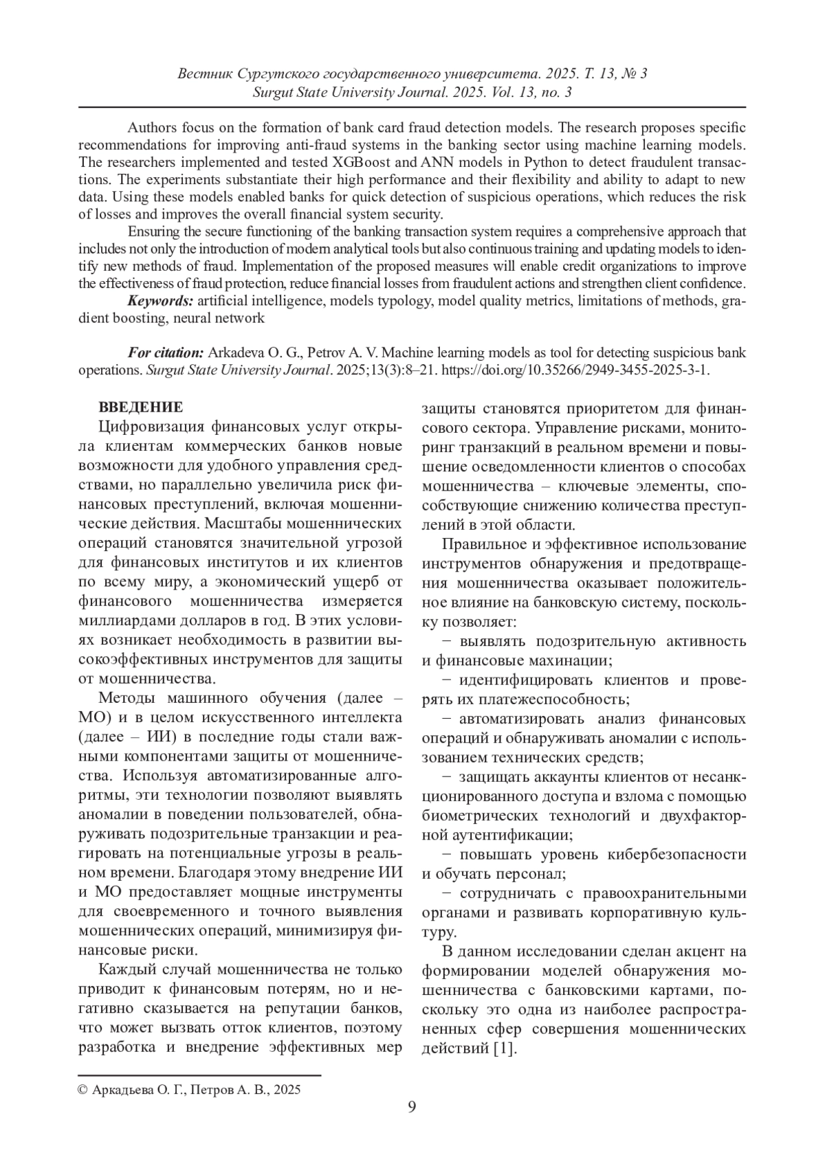 7. Аркадьева О. Г. Использование методов машинного обучения для отслеживания социальной инженерии в банковских транзакциях // Oeconomia et Jus. 2024. № 4. С. 1-14. https://doi.org/10.47026/2499-9636-2024-4-1-14.