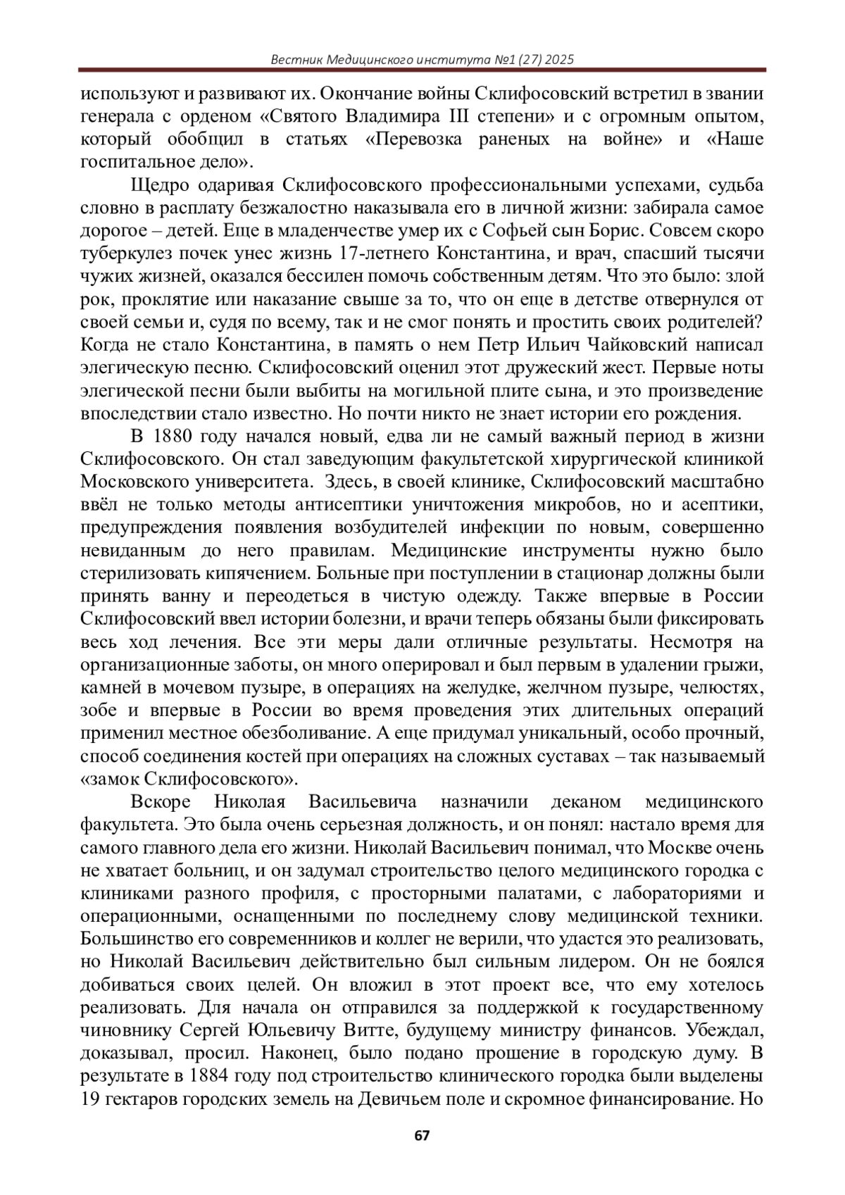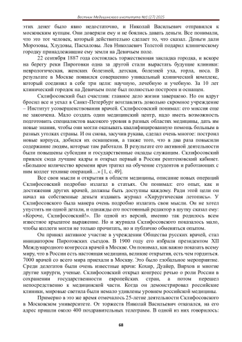 Данная статья посвящена историческому анализу жизни и деятельности выдающегося российского хирурга Николая Васильевича Склифосовского (1836-1904). Имя Николая Склифосовского известно всем. В его честь назван знаменитый институт скорой помощи в Москве, но жизнь врача окутана загадками и легендами. В данной статье мы попробуем приоткрыть завесу тайны и рассказать о его яркой, интересной и трагической судьбе. В статье исследован неоценимый вклад Склифосовского в развитие медицины, в частности в развитие военно-полевой хирургии, а также антисептического и асептического методов лечения. Богатый профессиональный опыт, полученный в четырех кровопролитных войнах, позволил ему усовершенствовать способы и методы лечения ранений в сложнейших военно-полевых условиях. За заслуги в области военной хирургии награжден различными орденами. По его инициативе был создан Клинический городок Императорского Московского университета на Девичьем поле.