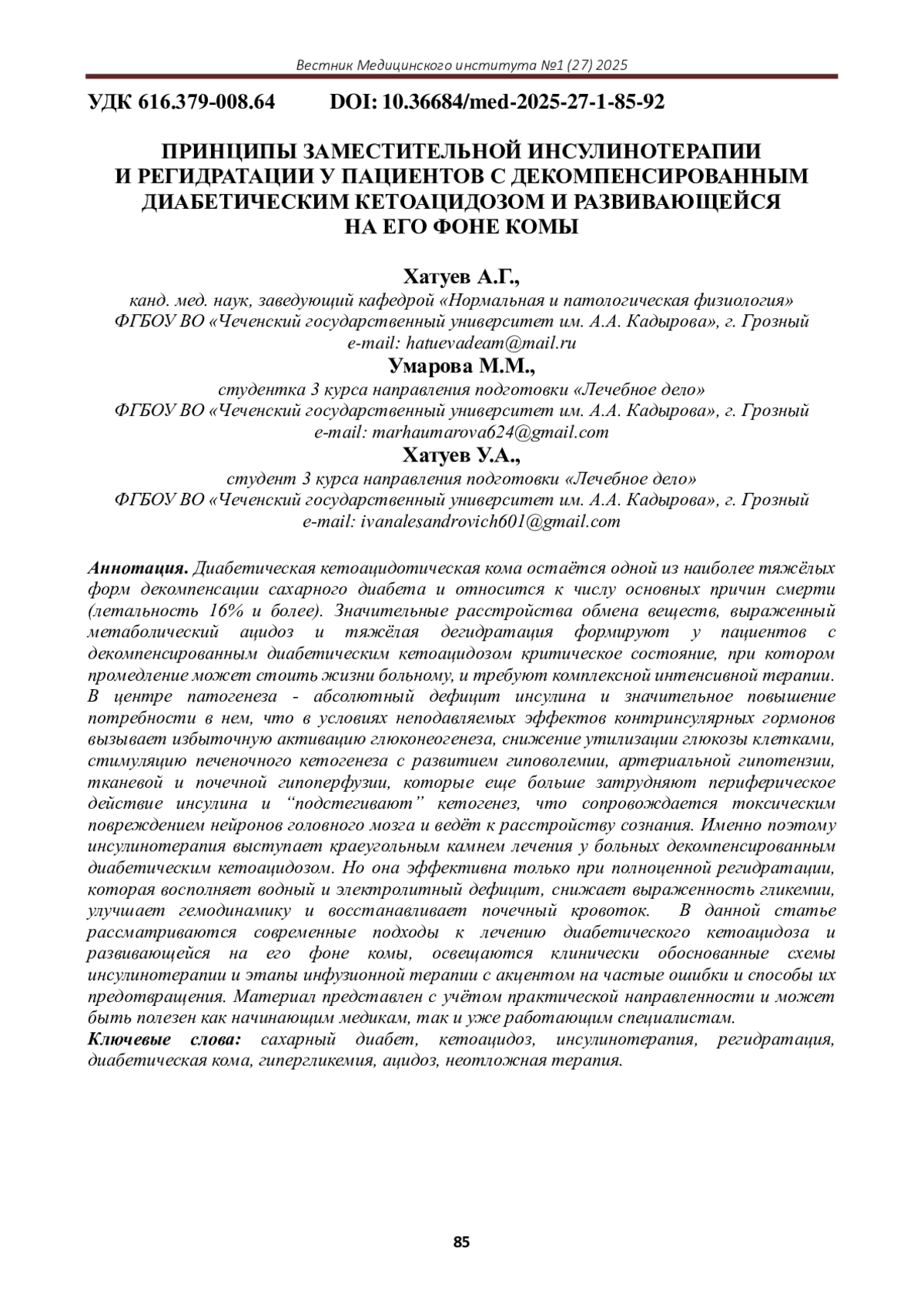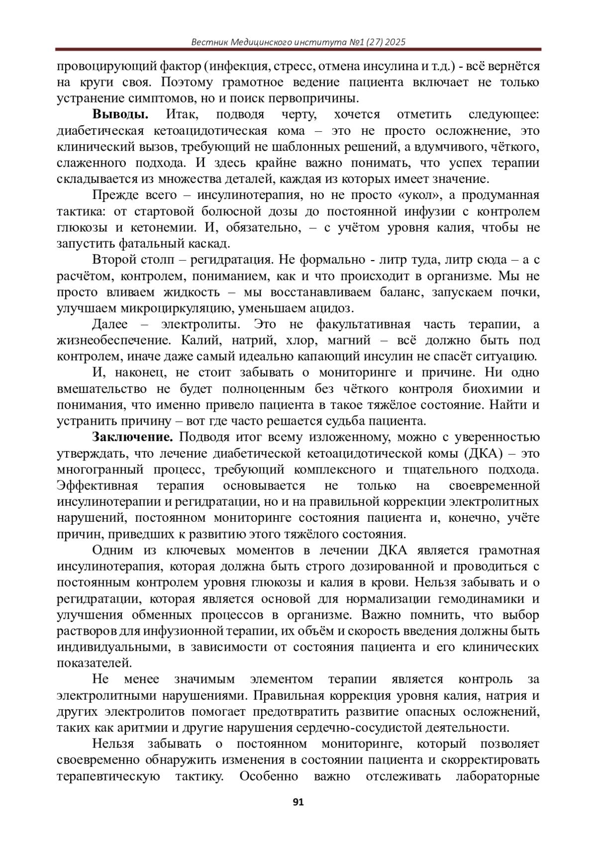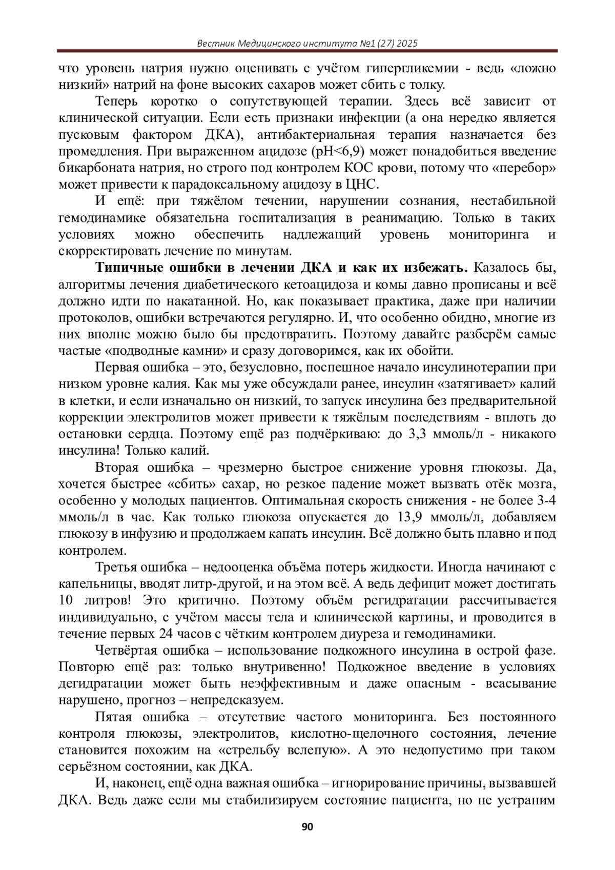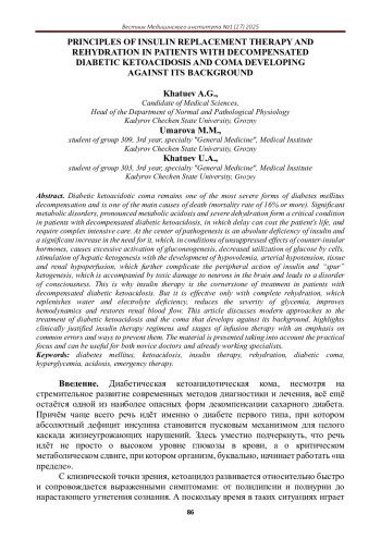 Диабетическая кетоацидотическая кома остаётся одной из наиболее тяжёлых форм декомпенсации сахарного диабета и относится к числу основных причин смерти (летальность 16% и более). Значительные расстройства обмена веществ, выраженный метаболический ацидоз и тяжёлая дегидратация формируют у пациентов с декомпенсированным диабетическим кетоацидозом критическое состояние, при котором промедление может стоить жизни больному, и требуют комплексной интенсивной терапии. В центре патогенеза - абсолютный дефицит инсулина и значительное повышение потребности в нем, что в условиях неподавляемых эффектов контринсулярных гормонов вызывает избыточную активацию глюконеогенеза, снижение утилизации глюкозы клетками, стимуляцию печеночного кетогенеза с развитием гиповолемии, артериальной гипотензии, тканевой и почечной гипоперфузии, которые еще больше затрудняют периферическое действие инсулина и “подстегивают” кетогенез, что сопровождается токсическим повреждением нейронов головного мозга и ведёт к расстройству сознания. Именно поэтому инсулинотерапия выступает краеугольным камнем лечения у больных декомпенсированным диабетическим кетоацидозом. Но она эффективна только при полноценной регидратации, которая восполняет водный и электролитный дефицит, снижает выраженность гликемии, улучшает гемодинамику и восстанавливает почечный кровоток. В данной статье рассматриваются современные подходы к лечению диабетического кетоацидоза и развивающейся на его фоне комы, освещаются клинически обоснованные схемы инсулинотерапии и этапы инфузионной терапии с акцентом на частые ошибки и способы их предотвращения. Материал представлен с учётом практической направленности и может быть полезен как начинающим медикам, так и уже работающим специалистам.