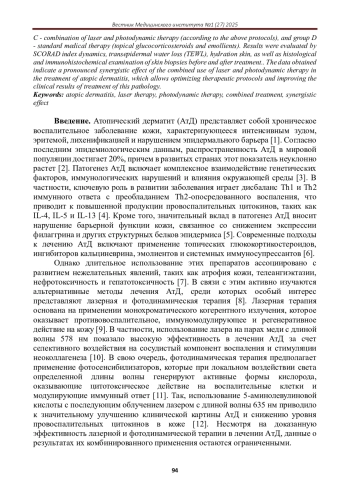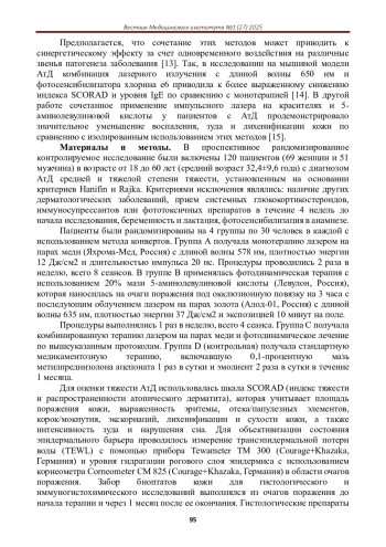 Статья: КОМБИНИРОВАННОЕ ПРИМЕНЕНИЕ ЛАЗЕРНЫХ И ФОТОДИНАМИЧЕСКИХ МЕТОДОВ В ЛЕЧЕНИИ АТОПИЧЕСКОГО ДЕРМАТИТА: ОЦЕНКА СИНЕРГЕТИЧЕСКОГО ЭФФЕКТА И ОПТИМИЗАЦИЯ ТЕРАПЕВТИЧЕСКИХ ПРОТОКОЛОВ (2025)