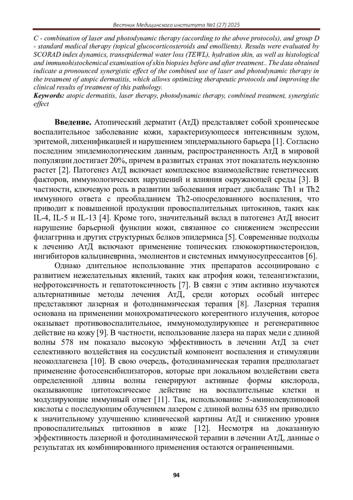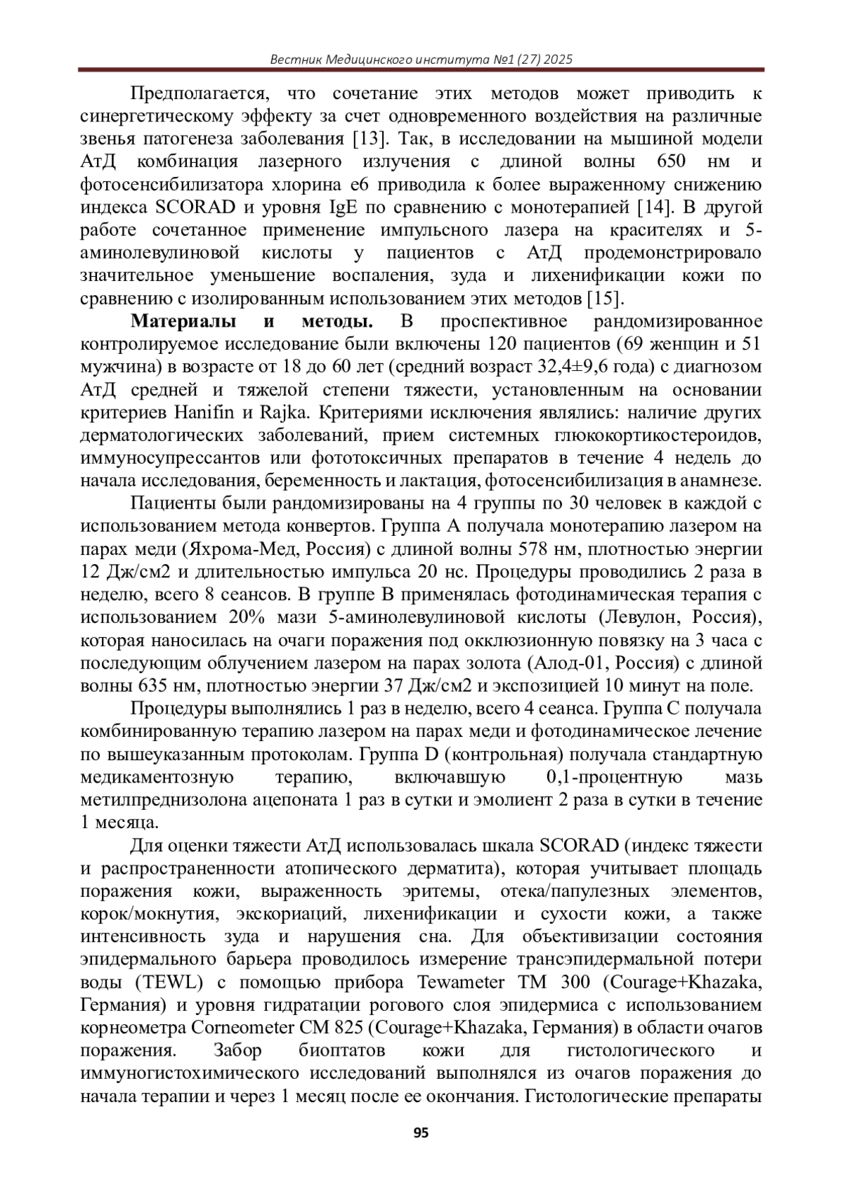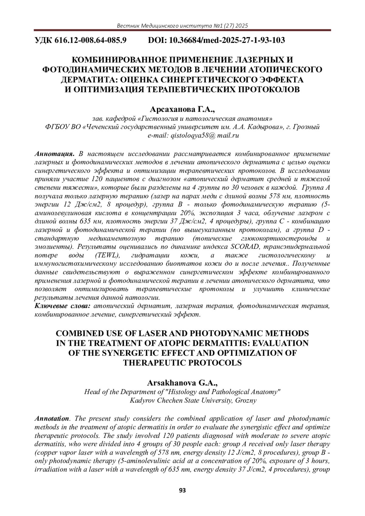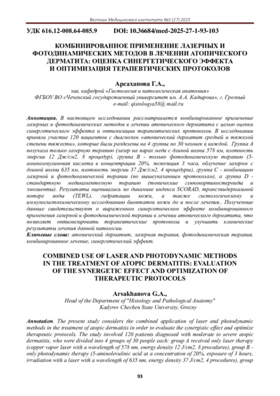 АРСАХАНОВА Г.А. КОМБИНИРОВАННОЕ ПРИМЕНЕНИЕ ЛАЗЕРНЫХ И ФОТОДИНАМИЧЕСКИХ МЕТОДОВ В ЛЕЧЕНИИ АТОПИЧЕСКОГО ДЕРМАТИТА: ОЦЕНКА СИНЕРГЕТИЧЕСКОГО ЭФФЕКТА И ОПТИМИЗАЦИЯ ТЕРАПЕВТИЧЕСКИХ ПРОТОКОЛОВ // ВЕСТНИК МЕДИЦИНСКОГО ИНСТИТУТА. 2025. № 1 (27)