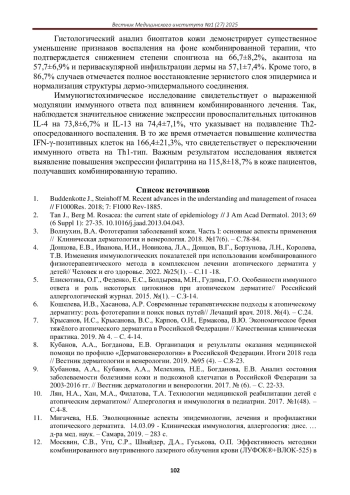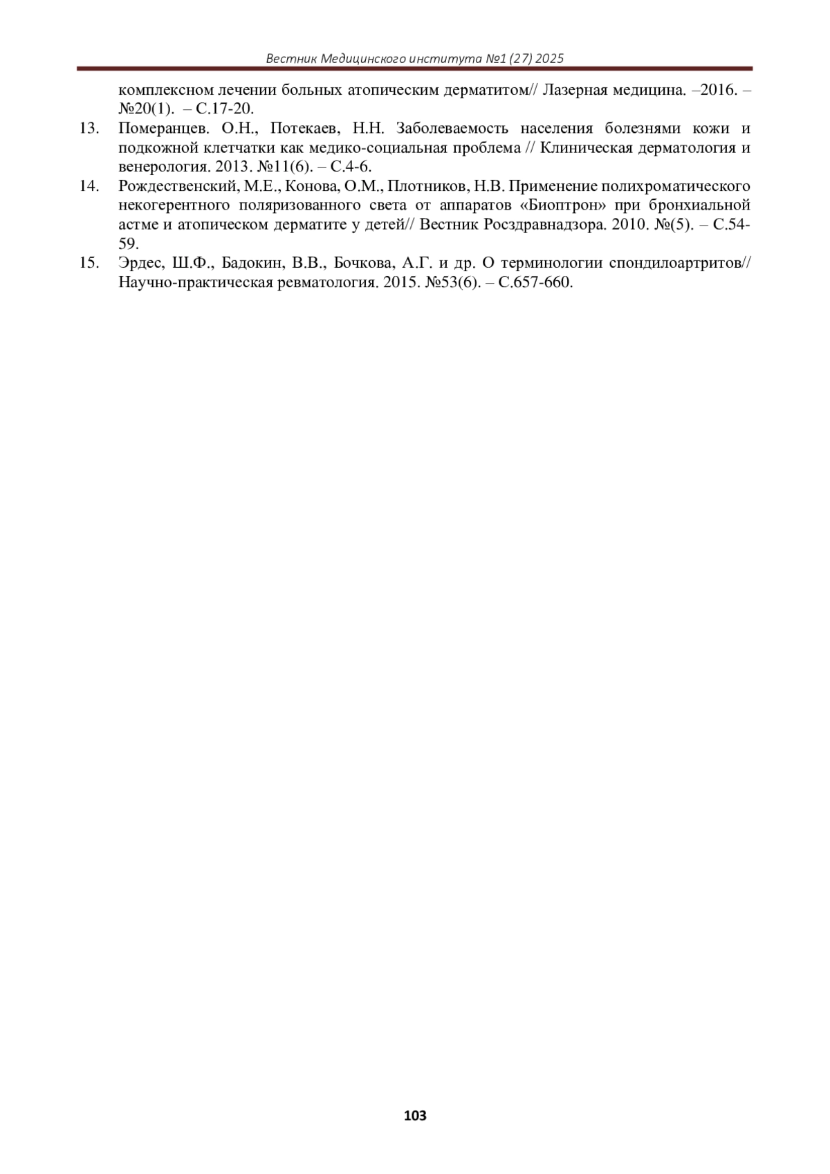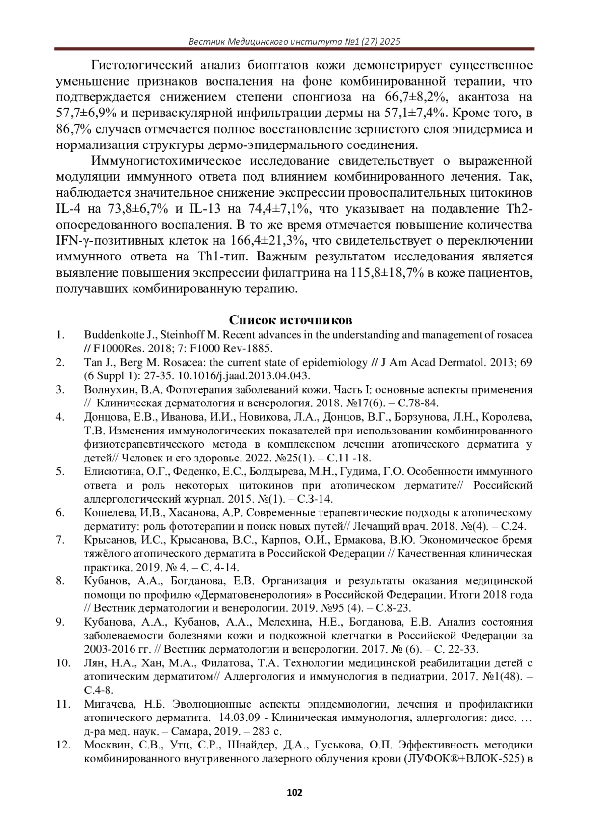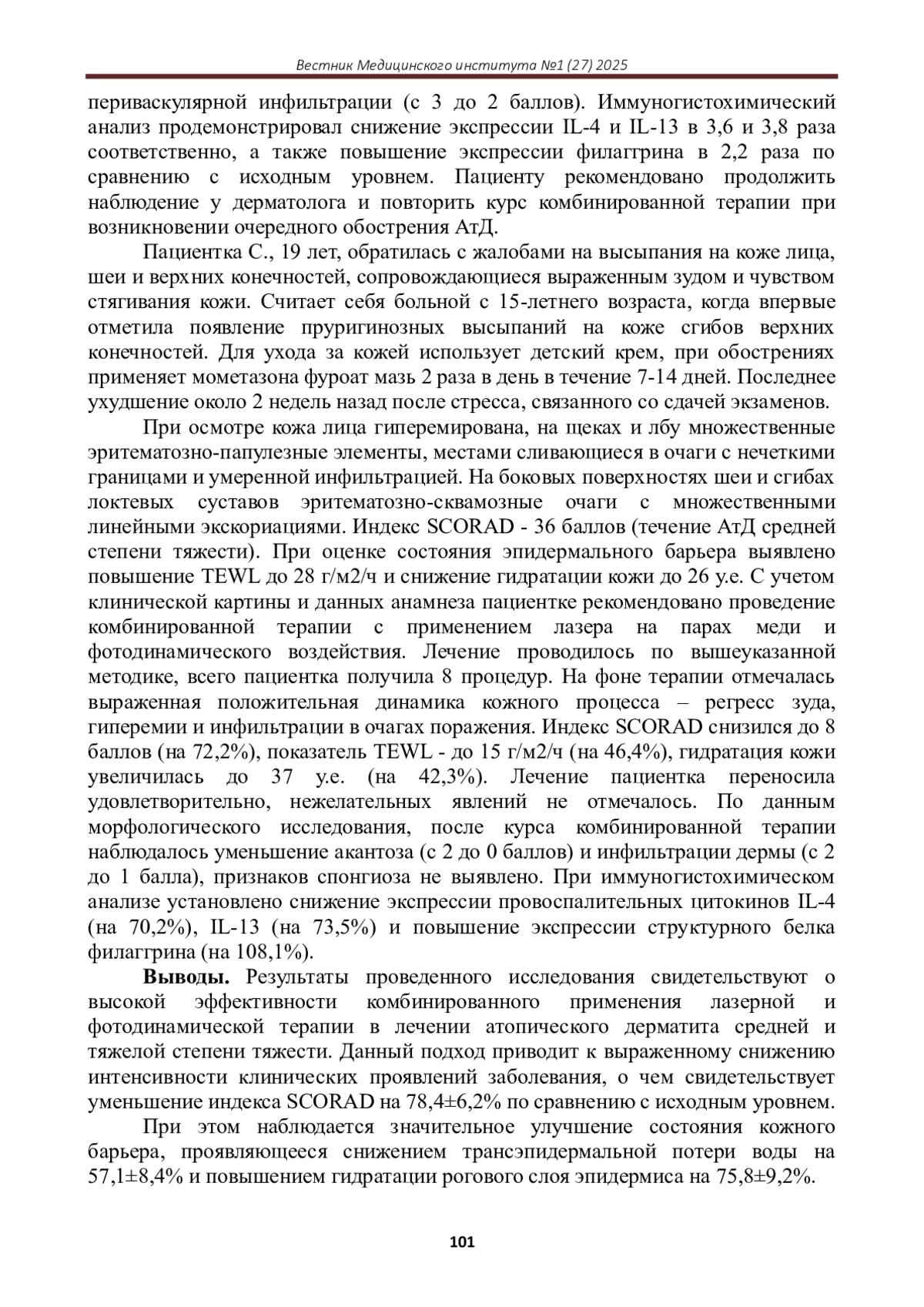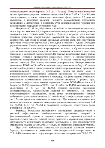 АРСАХАНОВА Г.А. КОМБИНИРОВАННОЕ ПРИМЕНЕНИЕ ЛАЗЕРНЫХ И ФОТОДИНАМИЧЕСКИХ МЕТОДОВ В ЛЕЧЕНИИ АТОПИЧЕСКОГО ДЕРМАТИТА: ОЦЕНКА СИНЕРГЕТИЧЕСКОГО ЭФФЕКТА И ОПТИМИЗАЦИЯ ТЕРАПЕВТИЧЕСКИХ ПРОТОКОЛОВ // ВЕСТНИК МЕДИЦИНСКОГО ИНСТИТУТА. 2025. № 1 (27)
