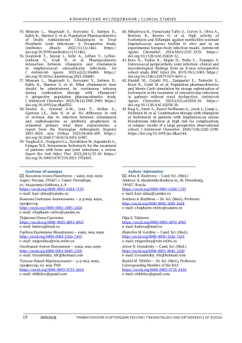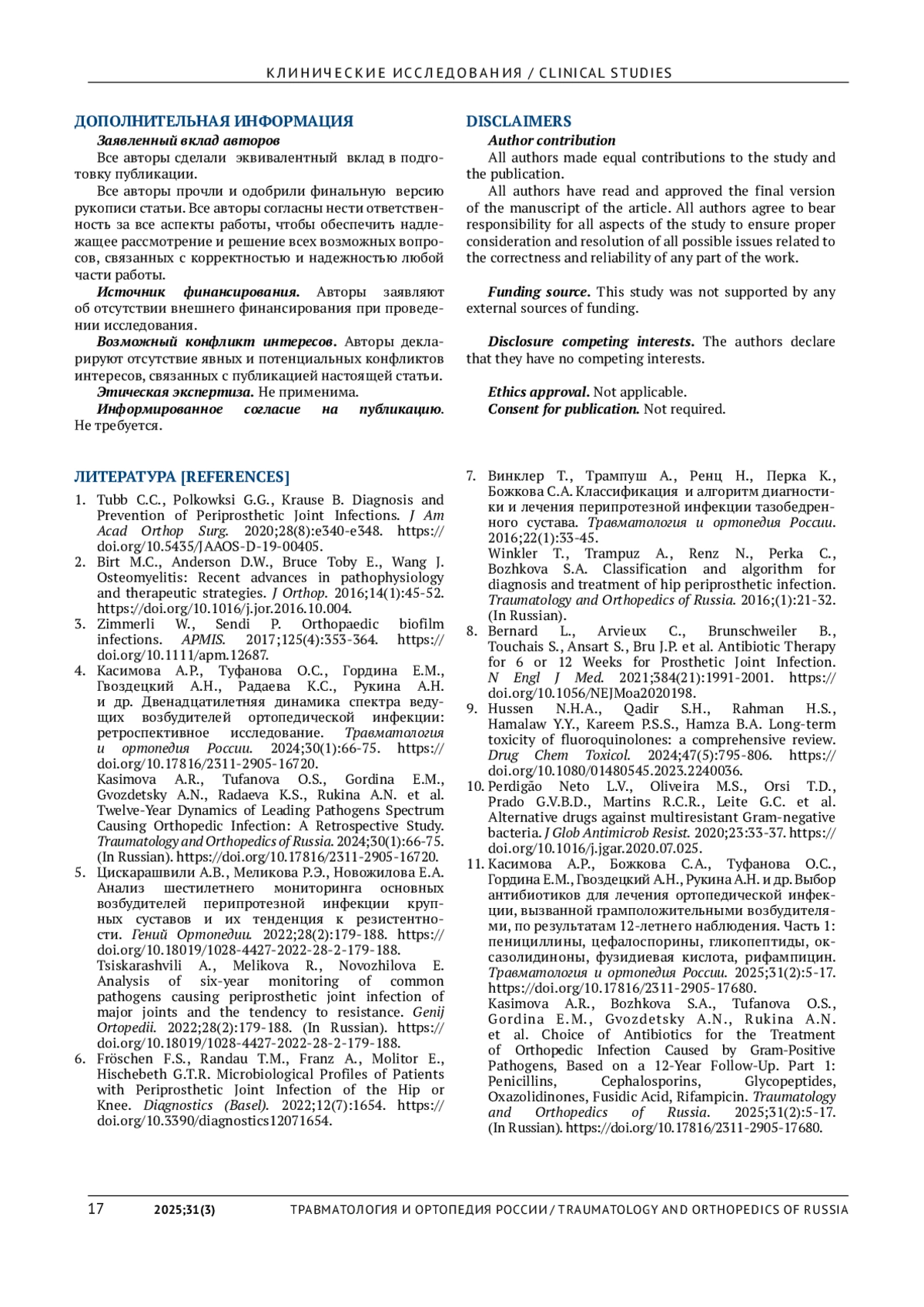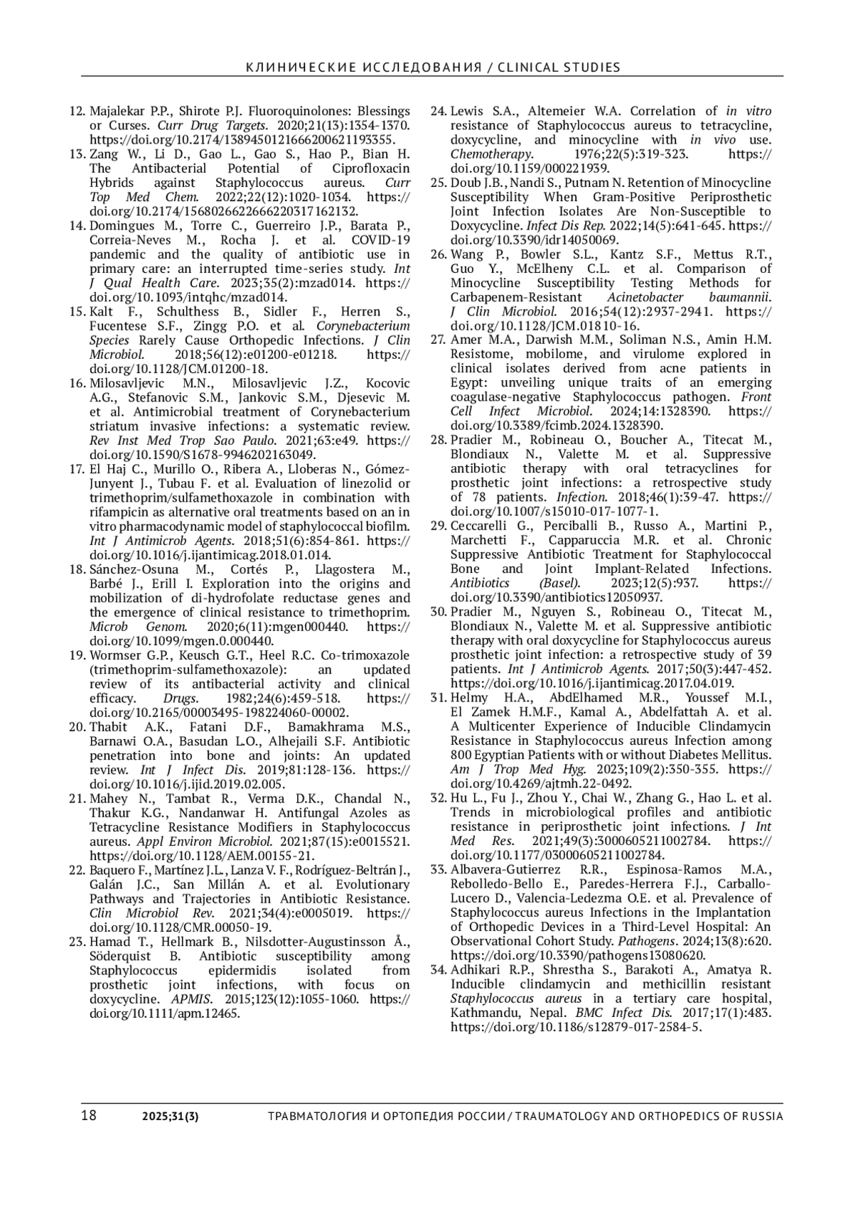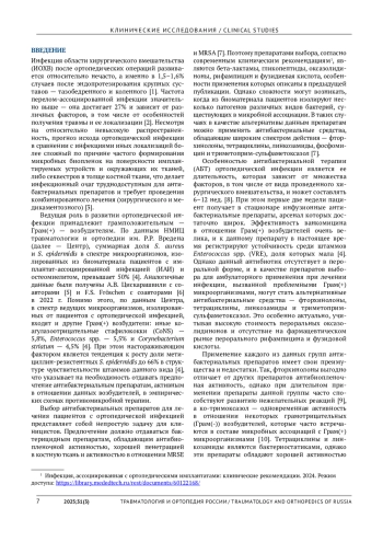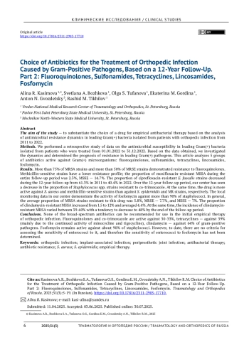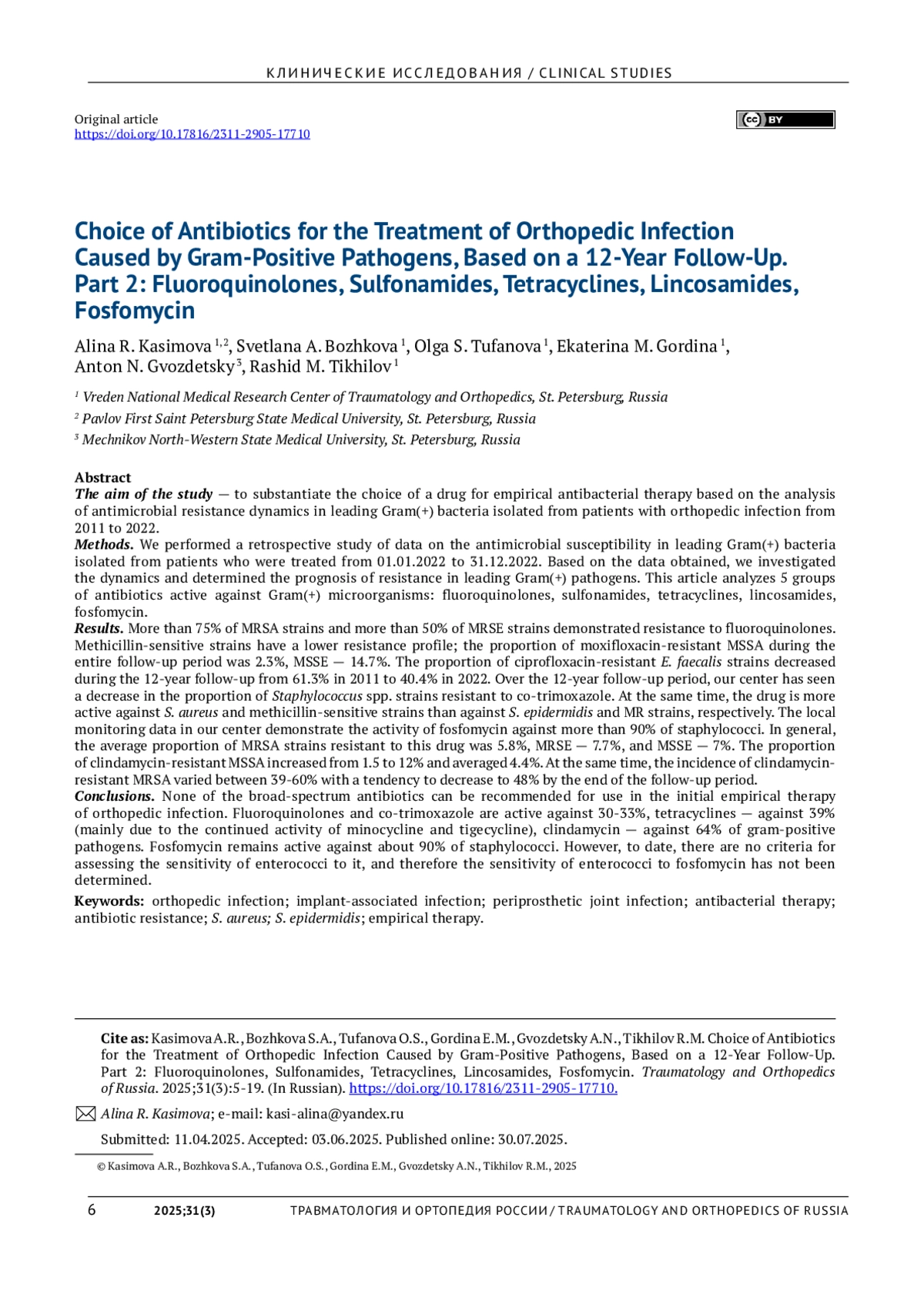 КАСИМОВА А. Р., БОЖКОВА С. А., ТУФАНОВА О. С., ГОРДИНА Е. М., ГВОЗДЕЦКИЙ А. Н., ТИХИЛОВ Р. М. ВЫБОР АНТИБИОТИКОВ ДЛЯ ЛЕЧЕНИЯ ОРТОПЕДИЧЕСКОЙ ИНФЕКЦИИ, ВЫЗВАННОЙ ГРАМПОЛОЖИТЕЛЬНЫМИ ВОЗБУДИТЕЛЯМИ, ПО РЕЗУЛЬТАТАМ 12-ЛЕТНЕГО НАБЛЮДЕНИЯ. ЧАСТЬ 2: ФТОРХИНОЛОНЫ, СУЛЬФАНИЛАМИДЫ, ТЕТРАЦИКЛИНЫ, ЛИНКОЗАМИДЫ, ФОСФОМИЦИН // ТРАВМАТОЛОГИЯ И ОРТОПЕДИЯ РОССИИ. 2025. № 3, ТОМ 31