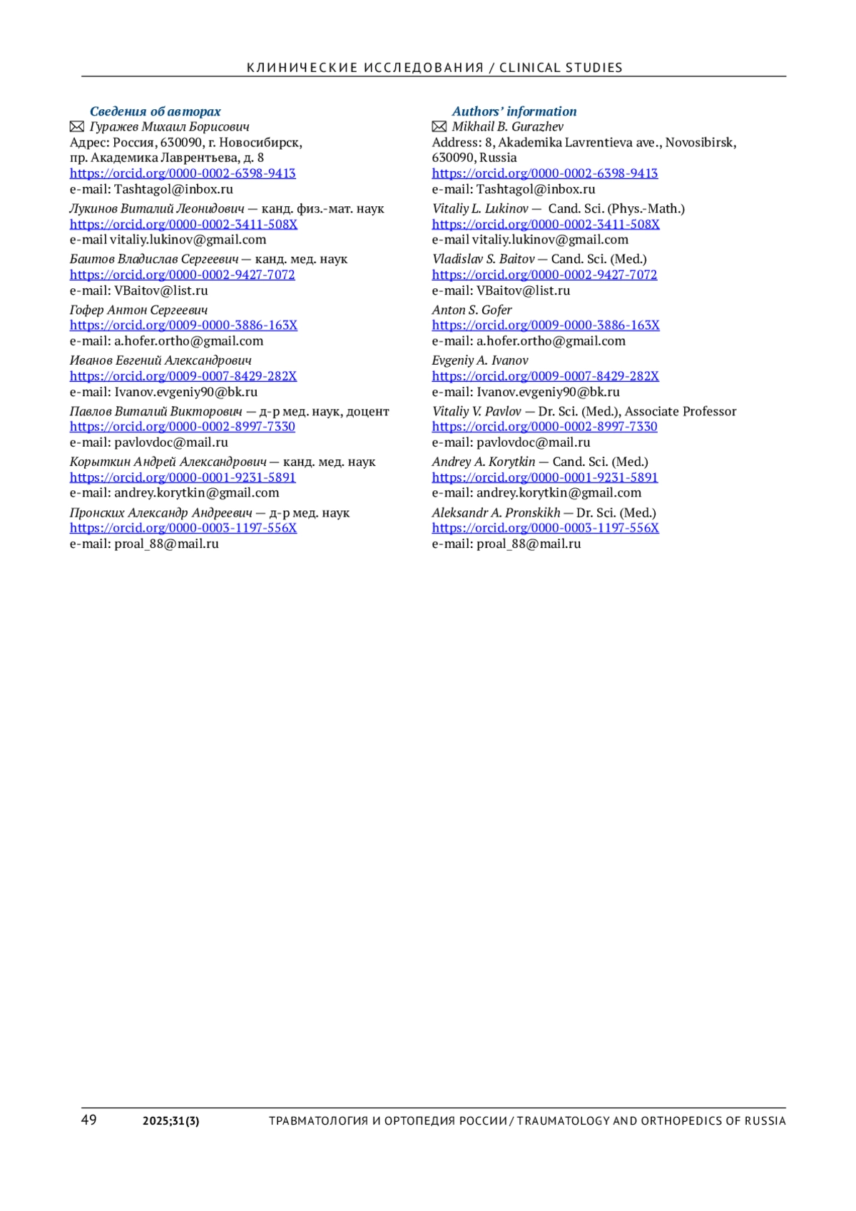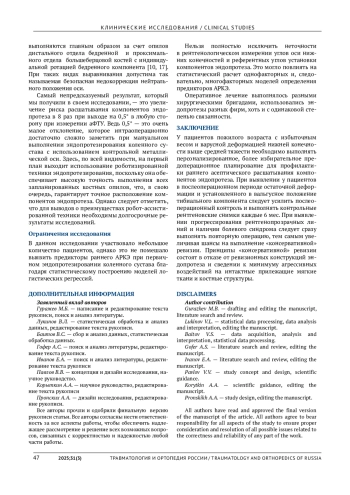 Заключение. У пациентов пожилого возраста с избыточным весом, имеющих выраженную варусную деформацию нижней конечности, следует избегать шаблонного предоперационного планирования и отдавать предпочтение персонализированному, более избирательному предоперационному планированию для профилактики раннего асептического расшатывания компонентов эндопротеза. В случаях выявления в послеоперационном периоде остаточной деформации и вальгусного положения тибиального компонента требуется усиленный контроль с проведением рентгенографических исследований каждые 6 мес. При прогрессировании рентгенопрозрачных линий и наличии болевого синдрома необходимо незамедлительно рассмотреть вопрос о проведении повторного хирургического вмешательства, что повышает вероятность успешного выполнения «консервативной» ревизии.