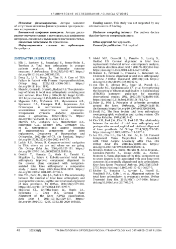 6. Omichi Y., Hamada D., Wada K., Tamaki Y., Shigekiyo S., Sairyo K. Robotic-assisted total knee arthroplasty improved component alignment in the coronal plane compared with navigation-assisted total knee arthroplasty: a comparative study. J Robot Surg. 2023;17(6):2831-2839. DOI: 10.1007/s11701-023-01708-6