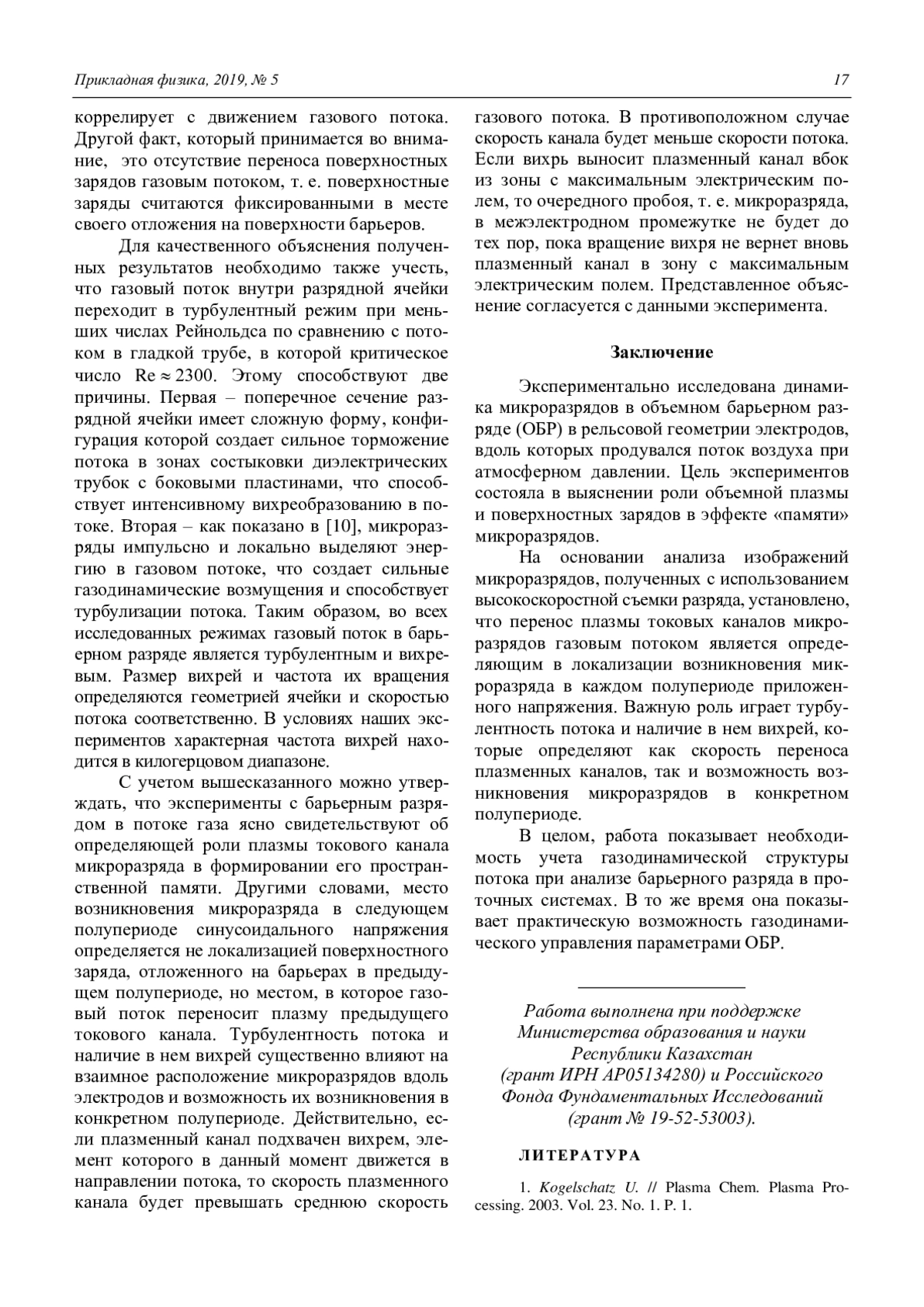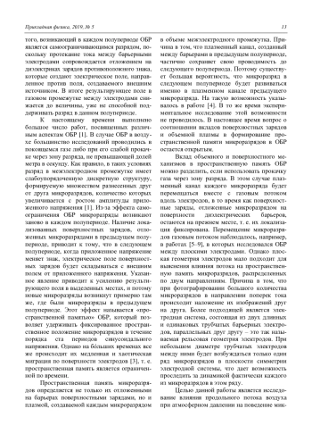 Экспериментально исследована динамика микроразрядов в объемном барьерном разряде (ОБР) в рельсовой геометрии электродов, вдоль которых продувался поток воздуха при атмосферном давлении. Цель экспериментов состояла в выяснении роли объемной плазмы и поверхностных зарядов в эффекте «памяти» микроразрядов. На основании анализа изображений микроразрядов, полученных с использованием высокоскоростной съемки разряда, установлено, что перенос плазмы токовых каналов микроразрядов газовым потоком является определяющим в локализации возникновения микроразряда в каждом полупериоде приложенного напряжения. Важную роль играет турбулентность потока и наличие в нем вихрей, которые определяют как скорость переноса плазменных каналов, так и возможность возникновения микроразрядов в конкретном полупериоде. В целом, работа показывает необходимость учета газодинамической структуры потока при анализе барьерного разряда в про-точных системах. В то же время она показывает практическую возможность газодинамического управления параметрами ОБР.