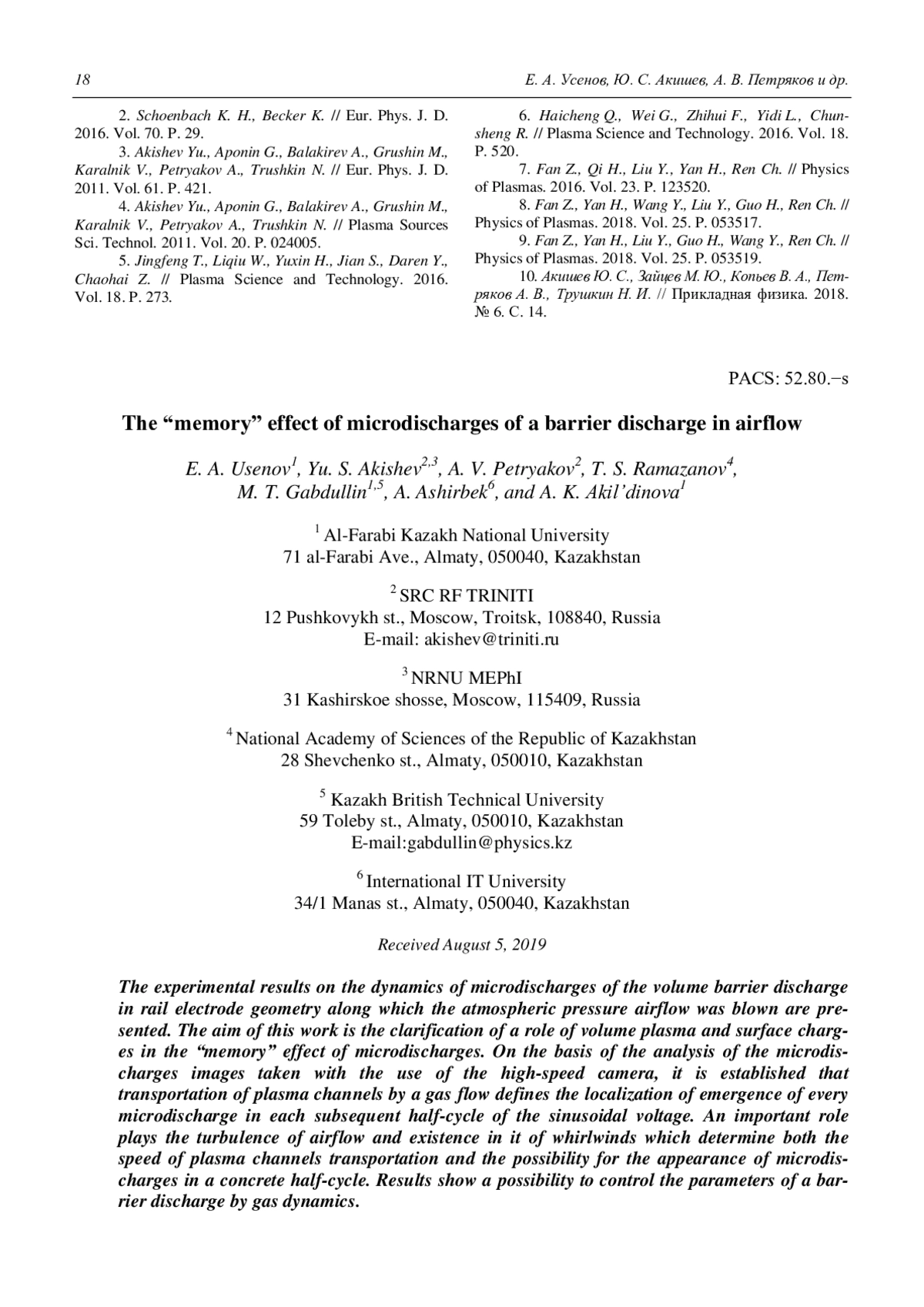 Усенов Е. А., Акишев Ю. С., Петряков А. В., Рамазанов Т. С., Габдуллин М. Т., Аширбек А., Акильдинова A. К. Эффект «памяти» микроразрядов барьерного разряда в потоке воздуха 12