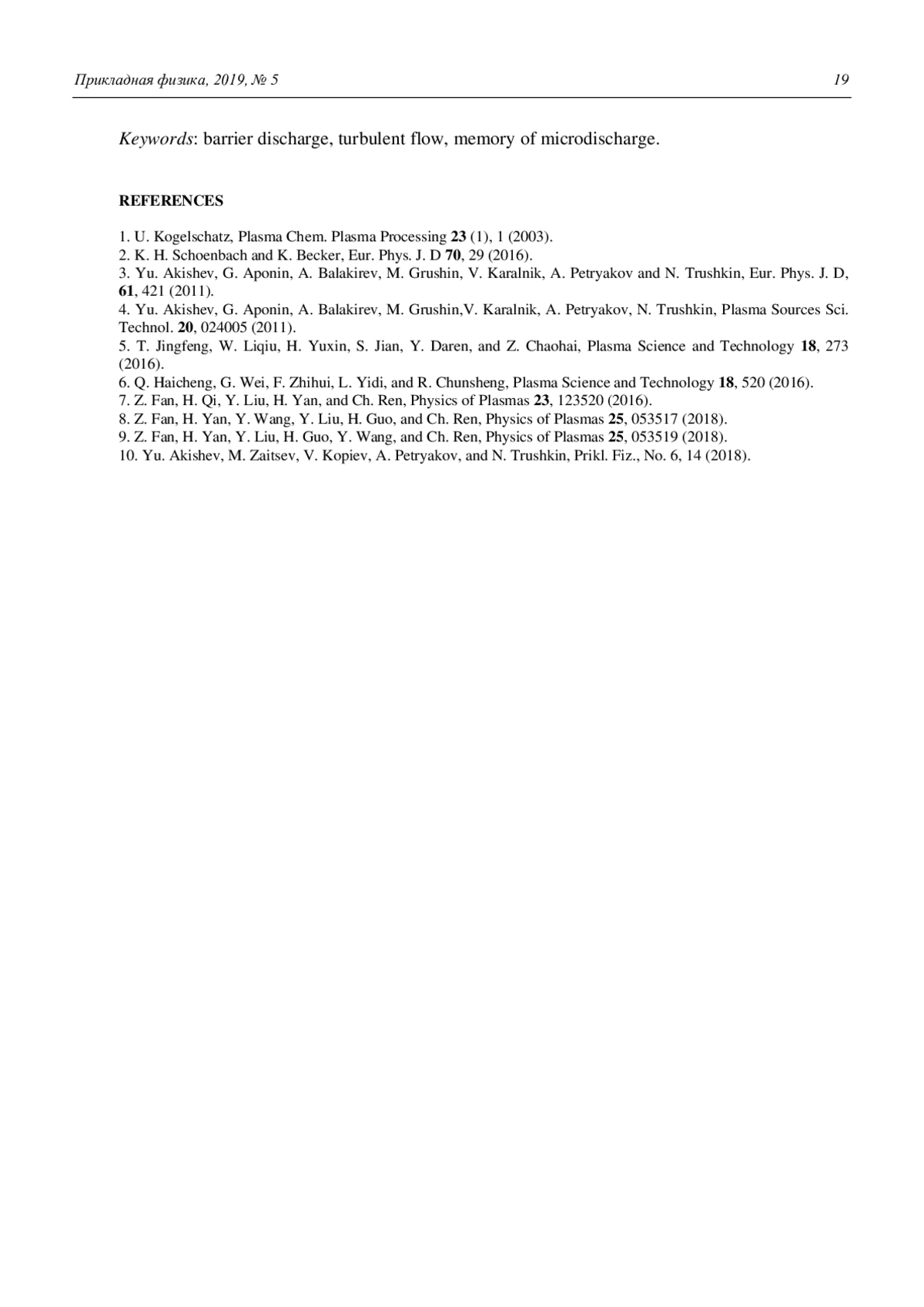 4. Akishev Yu., Aponin G., Balakirev A., Grushin M., Karalnik V., Petryakov A., Trushkin N. // Plasma Sources Sci. Technol. 2011. Vol. 20. P. 024005.