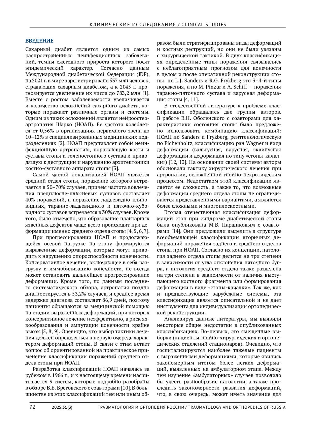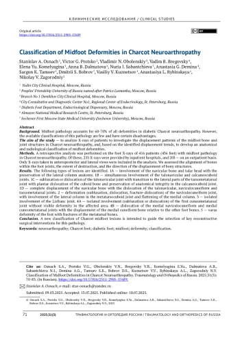Актуальность. Поражения среднего отдела стопы составляют 60–70% от всех деформаций при диабетической нейроостеоартропатии Шарко, однако имеющиеся классификации этой патологии немногочисленны и имеют недостатки.