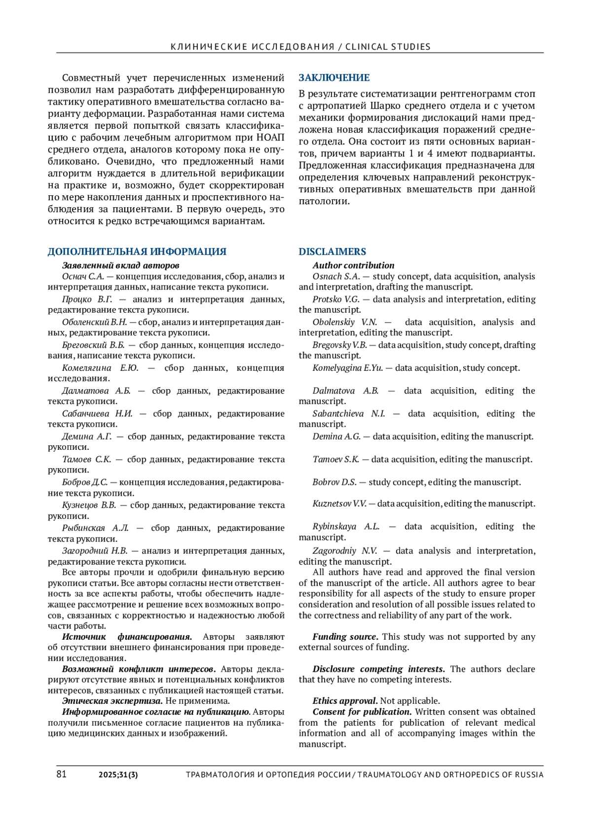 Результаты. Выделены следующие варианты поражения. 1А — поражение ладьевидной кости и головки таранной кости с сохранением анатомии латеральной колонны. 1Б — одновременное поражение таранно-ладьевидного и пяточно-кубовидного суставов. 1В — подвывих или вывих в таранно-ладьевидном суставе с переходом на латеральные отделы предплюсне-плюсневого сустава с дислокацией кубовидной кости плантарно и сохранением анатомической целостности в пяточно-кубовидном суставе. 1Г — тотальное смещение ладьевидной кости с вывихом в таранноладьевидном, ладьевидно-клиновидных и предплюсне-плюсневом суставах. 2 — деформация (подвывих, вывих, переломо-вывих) на уровне ладьевидно-клиновидного сустава с поражением латеральной колонны в кубовидноплюсневом суставе и уплощением медиальной колонны. 3 — изолированное поражение сустава Лисфранка. 4А — изолированное поражение (подвывих или вывих) первого плюсне-клиновидного сустава при отсутствии видимой деформации в зоне поражения. 4Б — вывих в медиальном ладьевидно-клиновидном и медиальном плюсне-клиновидном суставе со смещением медиальной клиновидной кости относительно остальных костей стопы. 5 — варусная деформация стопы с переломом плюсневых костей.