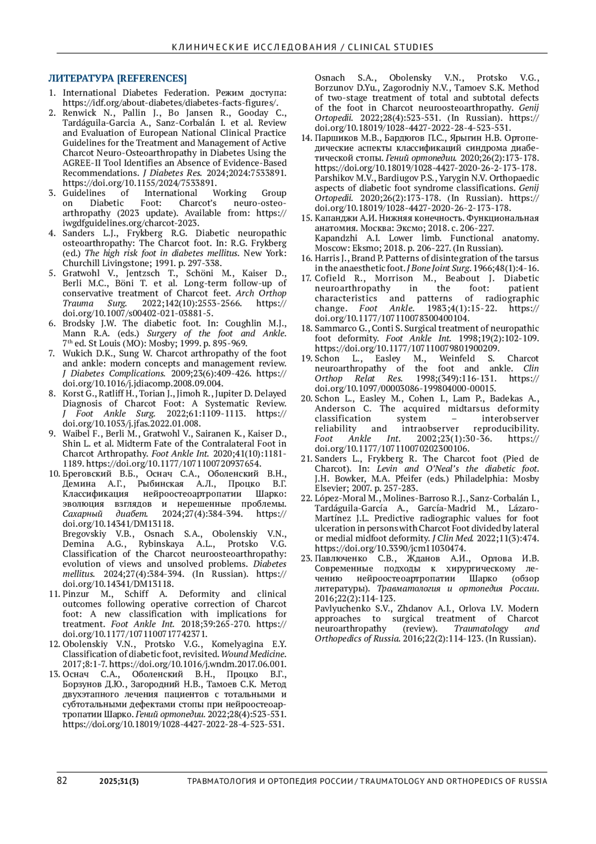 23. Павлюченко С.В., Жданов А.И., Орлова И.В. Современные подходы к хирургическому лечению нейроостеоартропатии Шарко (обзор литературы). Травматология и ортопедия России. 2016;22(2):114-123.