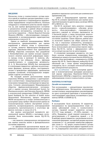 Патология стопы и голеностопного сустава является одной из наиболее распространенных в ортопедической практике и сопровождается выраженными нарушениями опороспособности, болевым синдромом и снижением качества жизни пациентов [1]. Для оценки функционального состояния и результатов лечения в данной области широко используются инструменты, основанные на самоотчетах пациентов — Patient-Reported Outcome Measures (PROMs) — обеспечивающие стандартизированную и воспроизводимую характеристику клинического статуса [2, 3].