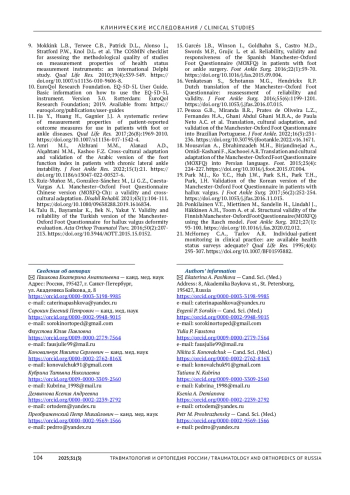 6. Goodall R., Borsky K, Harrison C.J., Welck M., Malhotra K., Rodrigues J.N. Structural validation of the Manchester-Oxford Foot Questionnaire for use in foot and ankle surgery. Bone Joint J. 2024;106-B(3):256-261. DOI: 10.1302/0301-620X.106B3.BJJ-2023-0414.R3