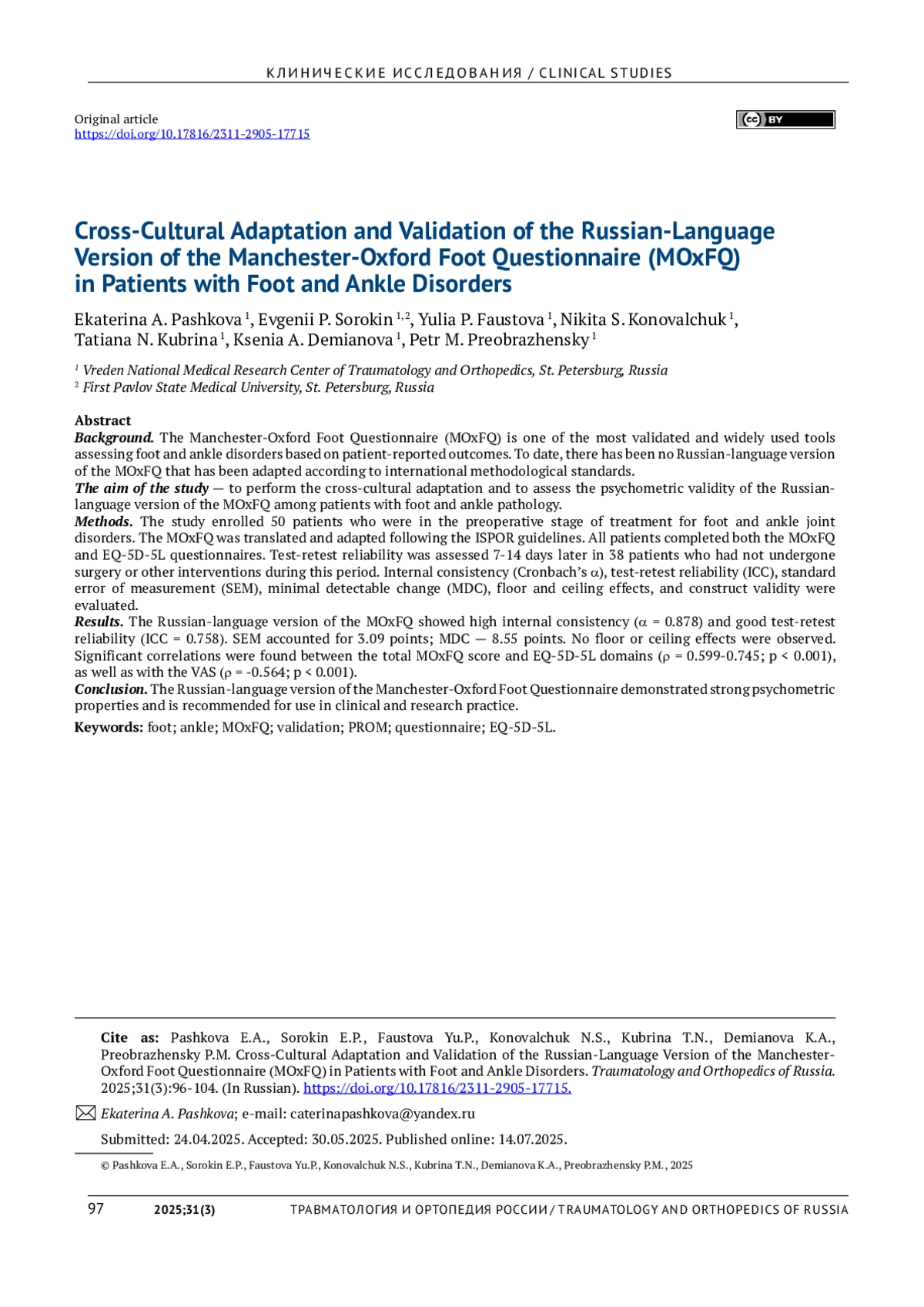 Цель исследования — кросс-культурная адаптация и психометрическая валидация русскоязычной версии опросника MOxFQ у пациентов с патологией стопы и голеностопного сустава.