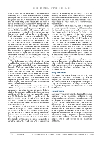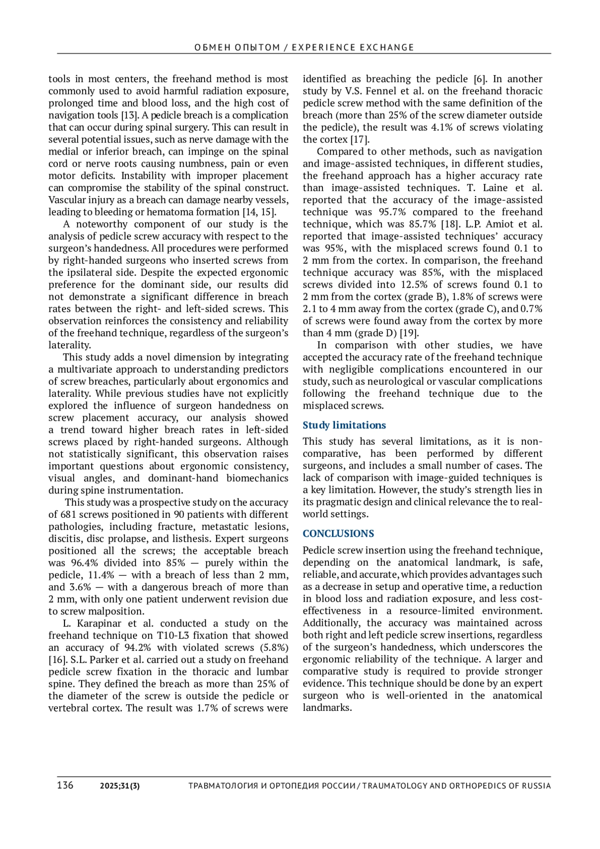 Заключение. Использование техники «свободной руки» при транспедикулярной фиксации является надежным и безопасным методом, который особенно полезен в условиях ограниченных ресурсов, являясь экономичной и безрадиационной альтернативой навигационным системам. Результаты проведенного исследования показали, что хирургическая эргономика, в частности предпочтение хирурга работать левой или правой рукой, не оказывает существенного влияния на успешность хирургического лечения при соблюдении техники.