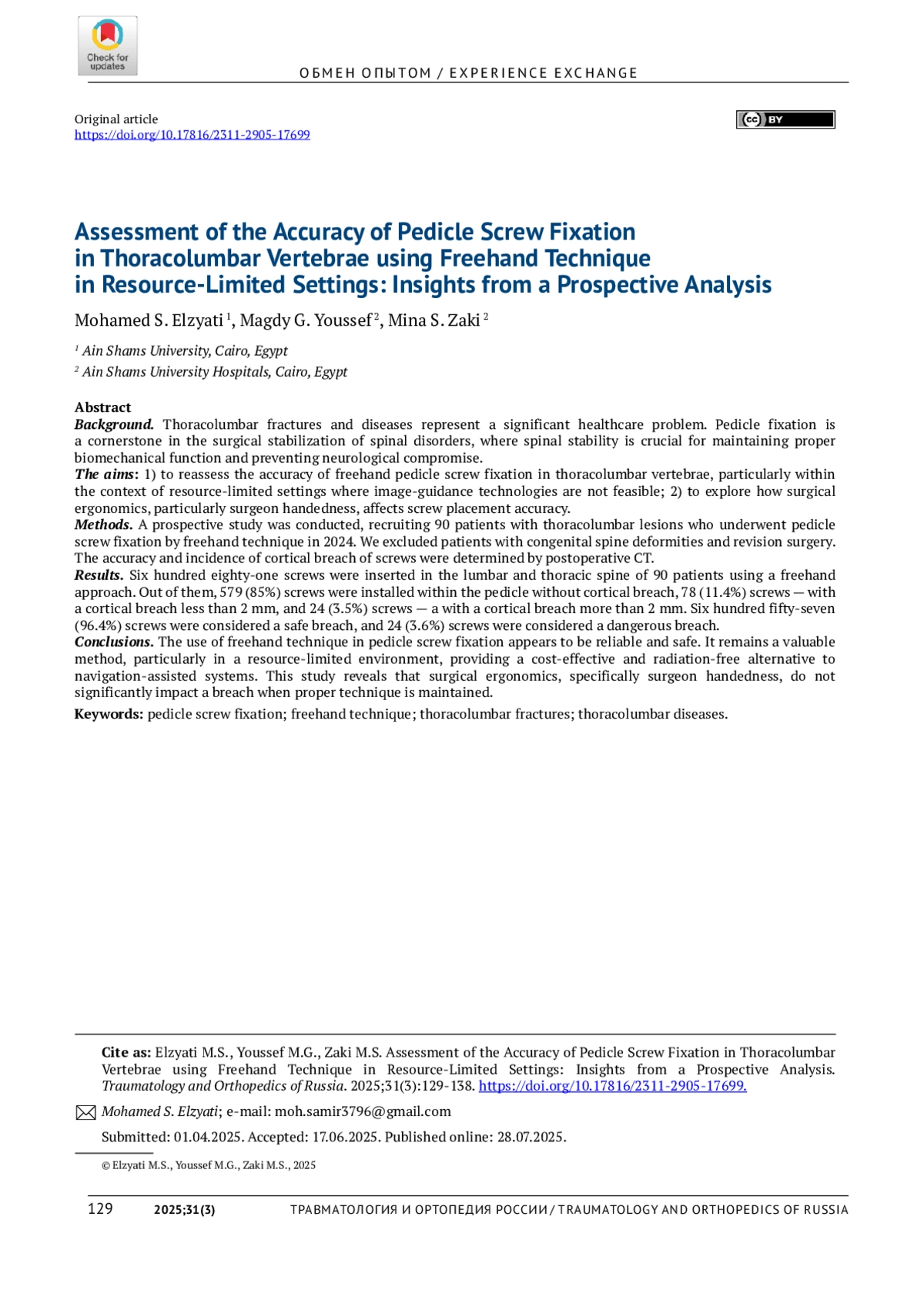 Материал и методы. Было проведено проспективное исследование, в котором приняли участие 90 пациентов с поражениями грудопоясничного отдела, которым в 2024 г. была выполнена транспедикулярная фиксация методом «свободной руки». Пациенты с врожденными деформациями позвоночника и предшествующими ревизиями были исключены. Точность фиксации винтов и частота повреждений кортикального слоя определяли при помощи послеоперационной компьютерной томографии.