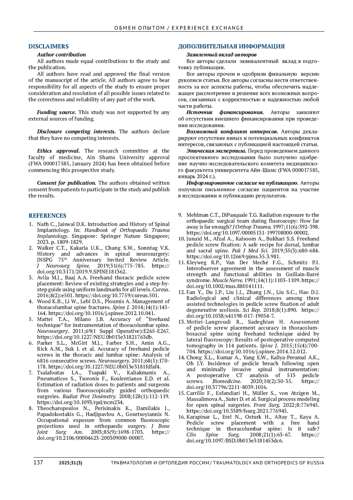 16. Карапинар Л., Эрел Н., Озтюрк Х., Алтай Т., Кая А. Установка транспедикулярных винтов методом «свободной руки» в грудопоясничном отделе позвоночника: безопасно ли это? Clin Spine Surg. 2008;21(1):63-67. DOI: 10.1097/BSD.0b013e3181453dc6