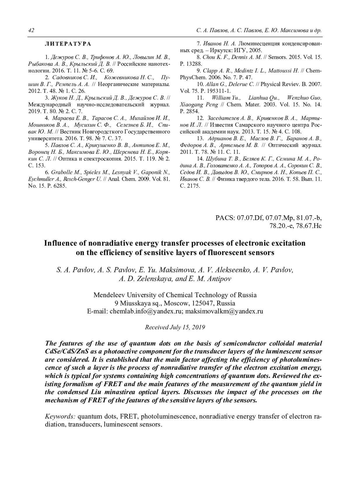 ПАВЛОВ С. А., ПАВЛОВ А. С., МАКСИМОВА Е. Ю., АЛЕКСЕЕНКО А. В., ПАВЛОВ А. В., ЗЕЛЕНСКАЯ А. Д., АНТИПОВ Е. М. ВЛИЯНИЕ БЕЗЫЗЛУЧАТЕЛЬНОГО ПЕРЕНОСА ЭНЕРГИИ ЭЛЕКТРОННОГО ВОЗБУЖДЕНИЯ НА ЭФФЕКТИВНОСТЬ ЛЮМИНЕСЦЕНТНЫХ СЕНСОРОВ // ПРИКЛАДНАЯ ФИЗИКА. 2019. №5