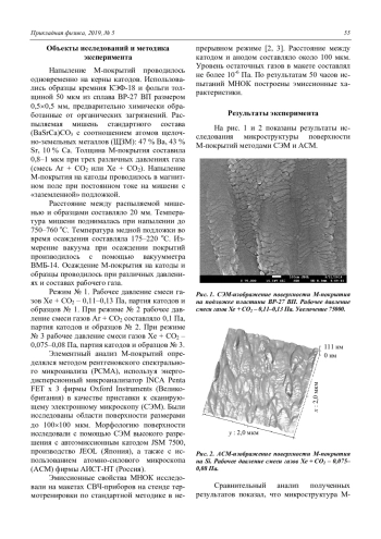 Показано, что изменение давления и состава рабочего газа при осаждении М-покрытий влияет на эмиссионные свойства МНОК. Получены зависимости шероховатости и размера зерен М-покрытия от давления и состава газа при ионно-плазменном напылении. Плотность М-покрытия и размер зерен возрастают с уменьшением давления рабочего газа, а шероховатость уменьшается. М-покрытие, полученное в смеси с Ar, имеет более мелкое зерно по сравнению с напылением в атмосфере Xe. М-покрытие катодов, синтезированное при меньшем давлении газа, имеет оптимальный состав ЩЗМ, более высокое содержание атомов углерода и бо́льший ток эмиссии. Анализ полученных эмиссионных характеристик показал, что при толщине М-покрытия 0,8–1 мкм наилучшими эмиссионными свойствами (ток катода, работа выхода) обладают МНОК с более плотным покрытием, осажденные при давлении рабочего газа (Xe + CO2) – 0,075–0,08 Па.