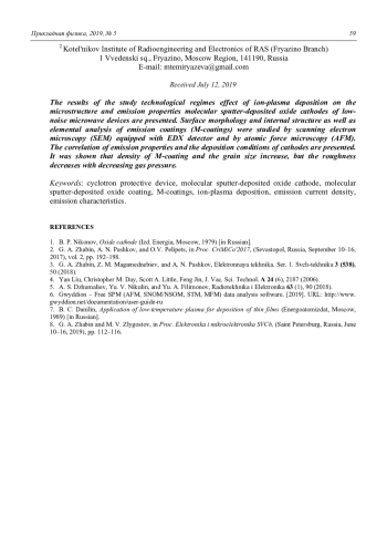 Жабин Г. А., Архипов Д. Ю., Темирязева М. П. Влияние режимов осаждения покрытий на микроструктуру и эмиссионные свойства молекулярно-напыленных оксидных катодов 54