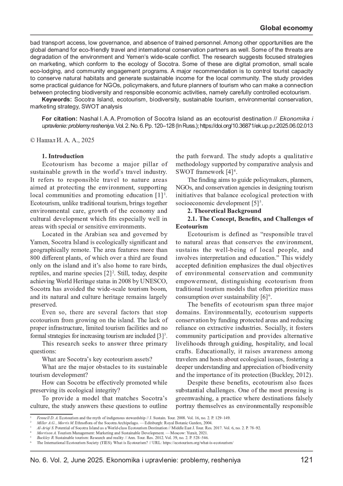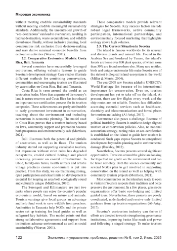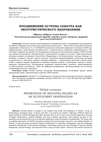 Остров Сокотра, расположенный в Аравийском море и находящийся под юрисдикцией Йемена, обладает исключительной экологической ценностью — более 30% его растений являются эндемиками. Несмотря на то, что ЮНЕСКО признала его объектом всемирного наследия в 2008 году, инфраструктура, политическая нестабильность и недостаточная глобальная осведомлённость препятствуют развитию экотуризма. В исследовании используется качественный подход и SWOT-анализ для оценки экологической, экономической и политической ситуации на Сокотре. Также рассмотрены успешные модели экотуризма в Коста- Рике, Мадагаскаре и на Галапагосских островах. Выводы показывают основные сильные стороны Сокотры: уникальное биоразнообразие, культурное наследие и удалённость от массового туризма. Основные барьеры — ограниченный транспорт, слабое управление и нехватка кадров. Возможности включают мировой интерес к устойчивому туризму и между народное сотрудничество. Исследование предлагает маркетинговые стратегии, ориентированные на экологическую устойчивость, такие как цифровое продвижение, маломасштабные эко-гостиницы и вовлечение местного населения.