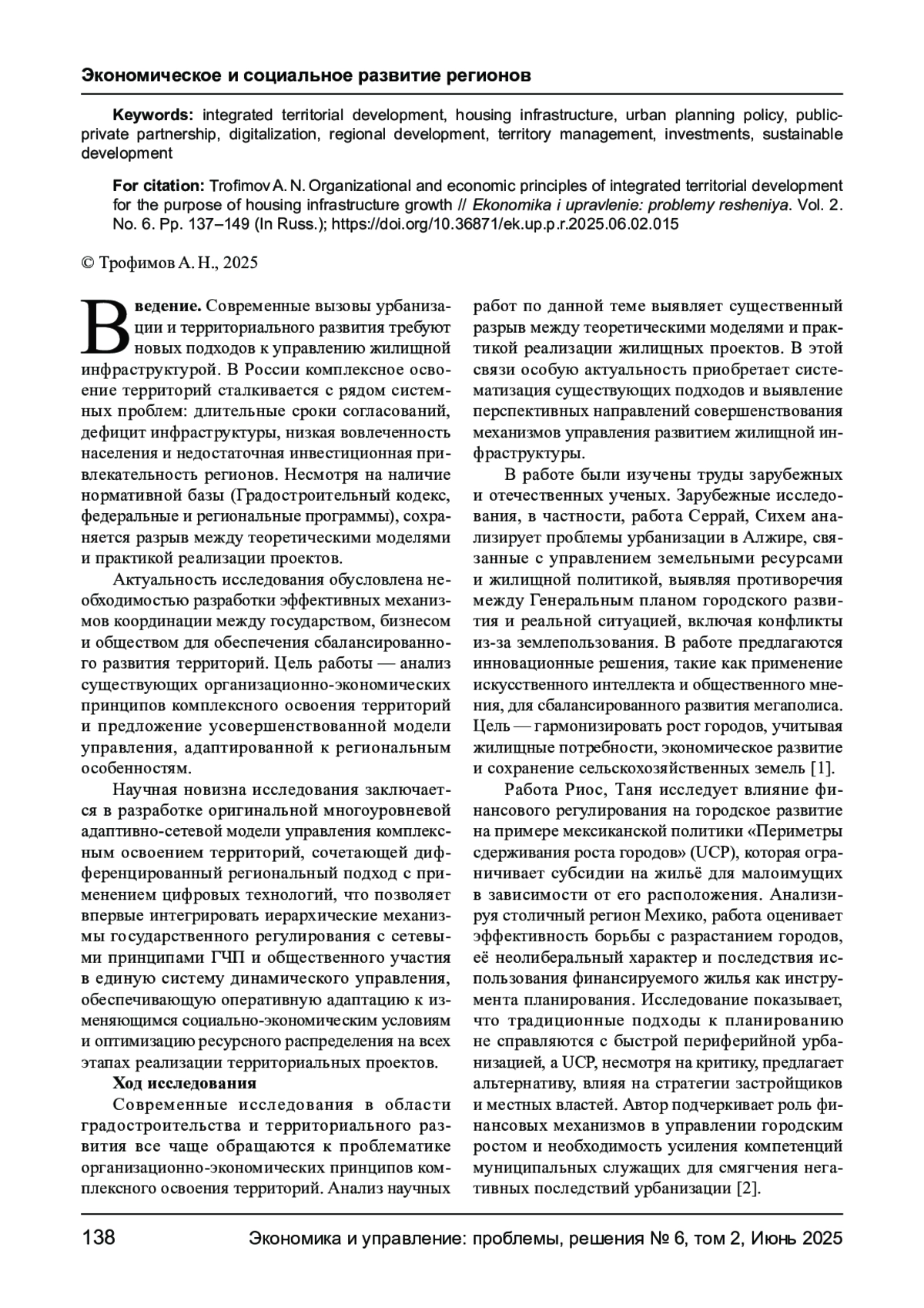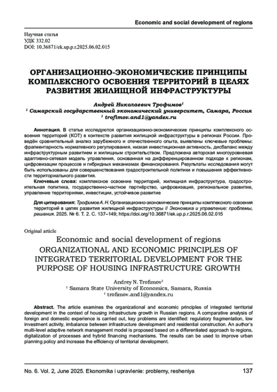 В статье исследуются организационно- экономические принципы комплексного освоения территорий (КОТ) в контексте развития жилищной инфраструктуры в регионах России. Проведён сравнительный анализ зарубежного и отечественного опыта, выявлены ключевые проблемы: фрагментарность нормативного регулирования, низкая инвестиционная активность, дисбаланс между инфраструктурным развитием и жилищным строительством. Предложена авторская многоуровневая адаптивно- сетевая модель управления, основанная на дифференцированном подходе к регионам, цифровизации процессов и гибридных механизмах финансирования. Результаты исследования могут быть использованы для совершенствования градостроительной политики и повышения эффективности территориального развития.