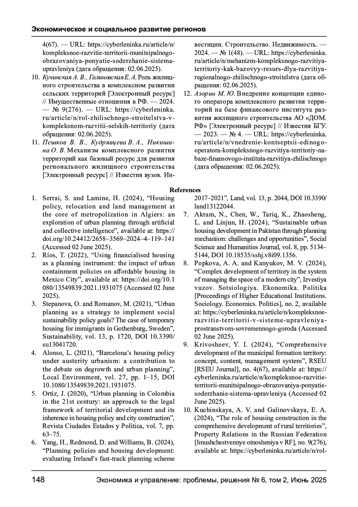 8. Попкова А. А., Канюков М. В. Комплексное развитие территории в системе управления пространством современного города [Электронный ресурс] // Известия вузов. Социология. Экономика. Политика. - 2024. - № 2. - URL: https://cyberleninka.ru/article/n/kompleksnoe-razvitie-territorii-v-sisteme-upravleniya-prostranstvom-sovremennogo-goroda (дата обращения: 02.06.2025).