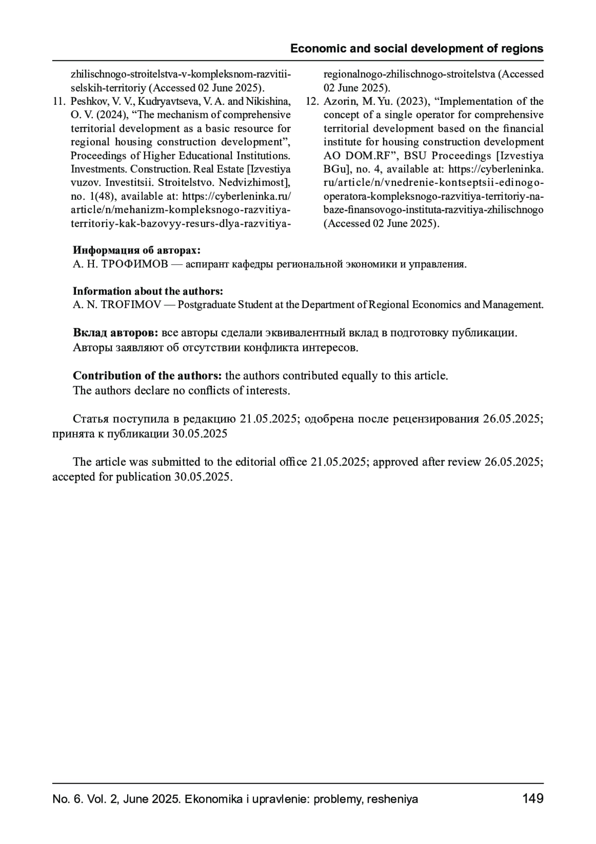 11. Пешков В. В., Кудрявцева В. А., Никишина О. В. Механизм комплексного развития территорий как базовый ресурс для развития регионального жилищного строительства [Электронный ресурс] // Известия вузов. Инвестиции. Строительство. Недвижимость. - 2024. - № 1(48). - URL: https://cyberleninka.ru/article/n/mehanizm-kompleksnogo-razvitiya-territoriy-kak-bazovyy-resurs-dlya-razvitiya-regionalnogo-zhilischnogo-stroitelstva (дата обращения: 02.06.2025). EDN: UINEZA