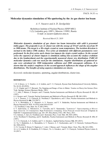 Назаров А. В., Завильгельский А. Д. Молекулярно-динамическое моделирование распыления молибдена пучком газовых кластерных ионов аргона 60