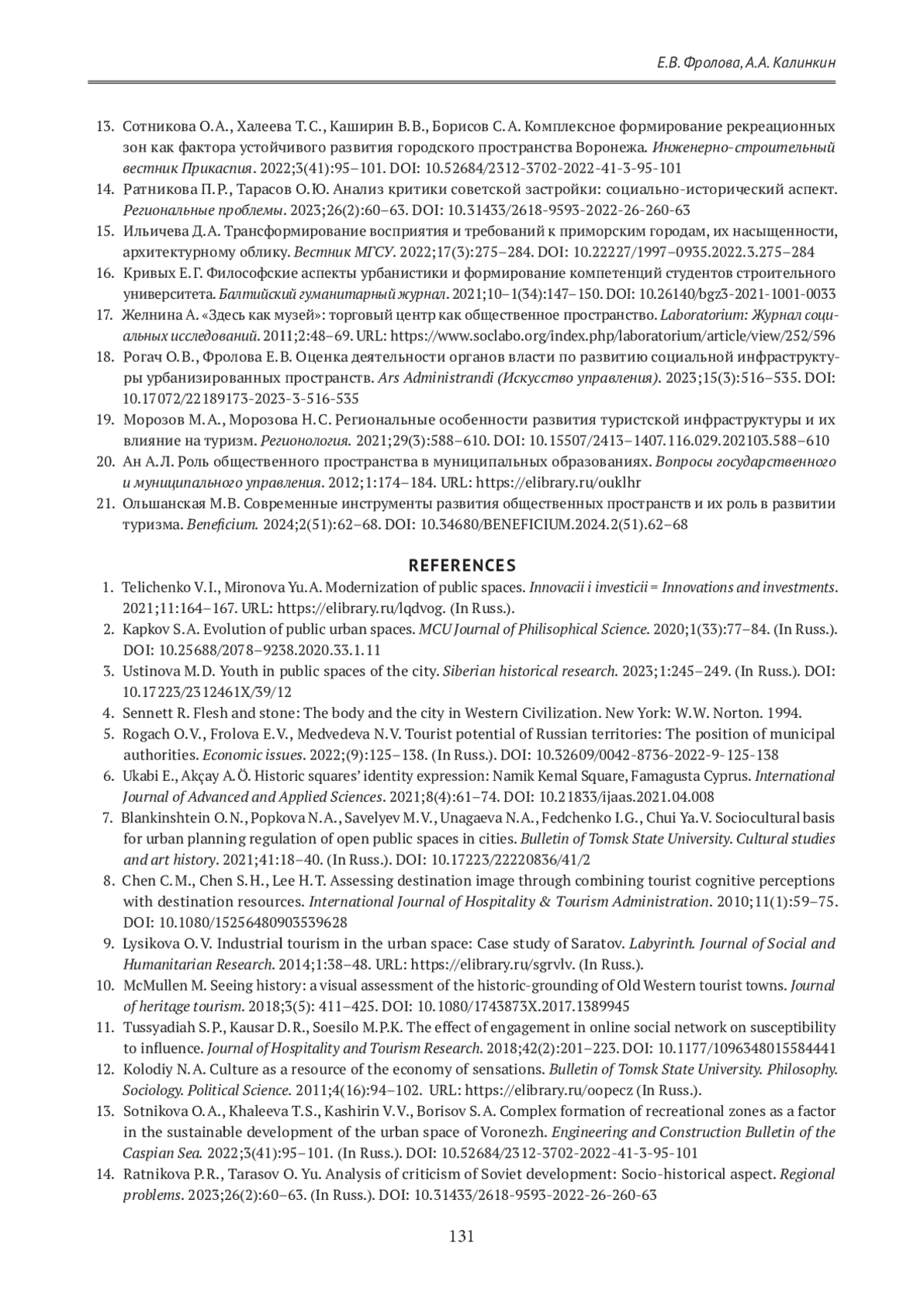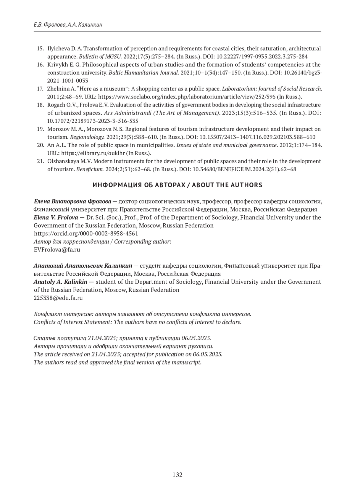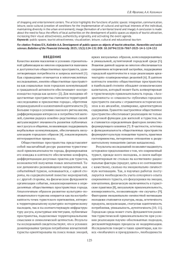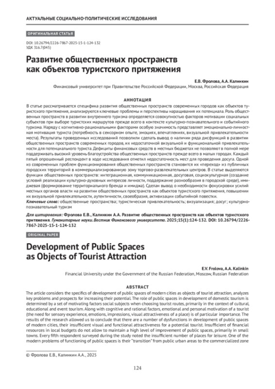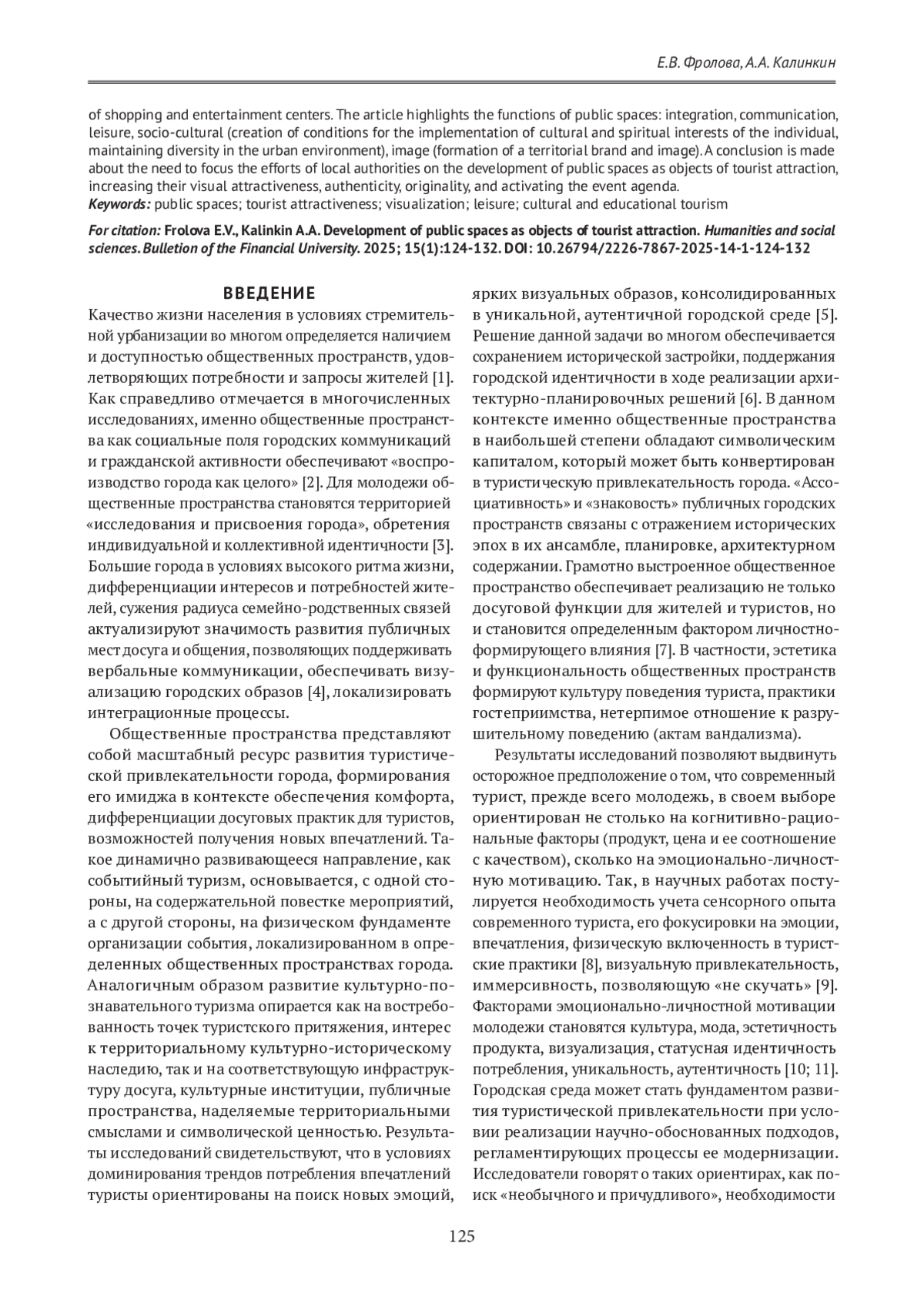 ФРОЛОВА Е. В., КАЛИНКИН А. А. РАЗВИТИЕ ОБЩЕСТВЕННЫХ ПРОСТРАНСТВ КАК ОБЪЕКТОВ ТУРИСТСКОГО ПРИТЯЖЕНИЯ // ГУМАНИТАРНЫЕ НАУКИ. ВЕСТНИК ФИНАНСОВОГО УНИВЕРСИТЕТА. 2025. ТОМ 15, № 1